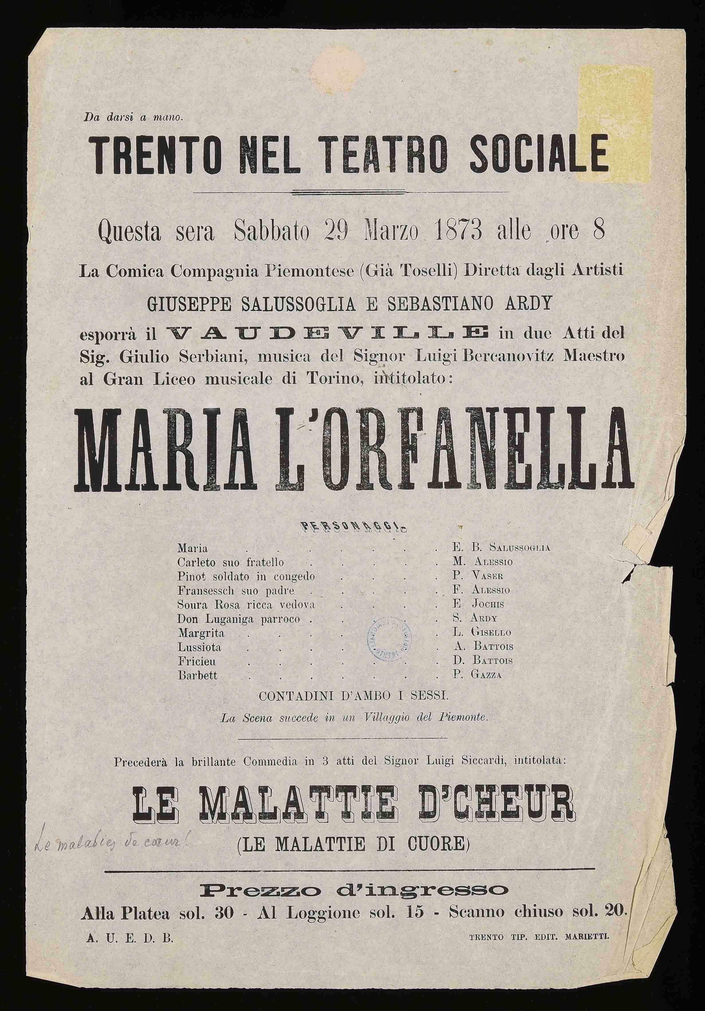 | Trento nel Teatro Sociale. Questa sera sabbato 29 marzo 1873 alle ore 8 |