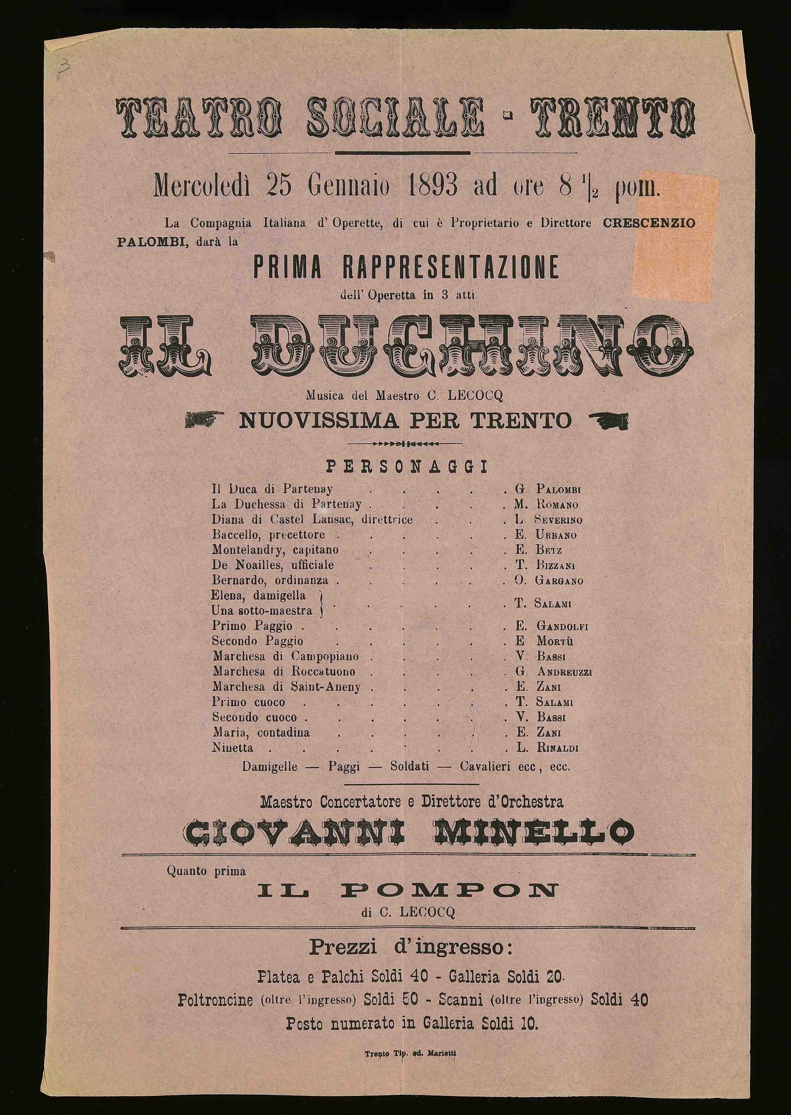 Teatro Sociale – Trento. Mercoledì 25 gennaio 1893 ad ore 8 ½ pom.