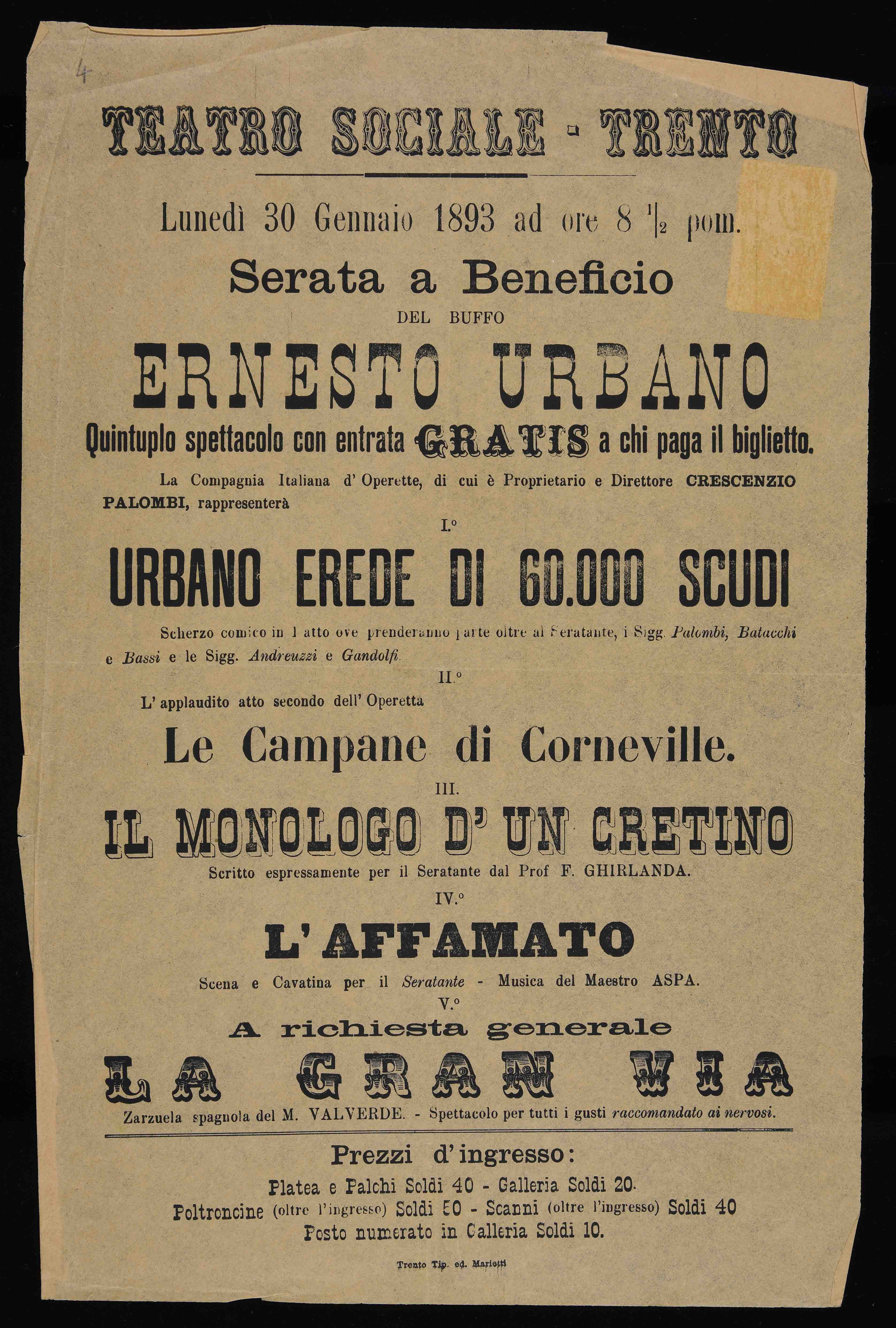 Teatro Sociale – Trento. Lunedì 30 gennaio 1893 ad ore 8 ½ pom.