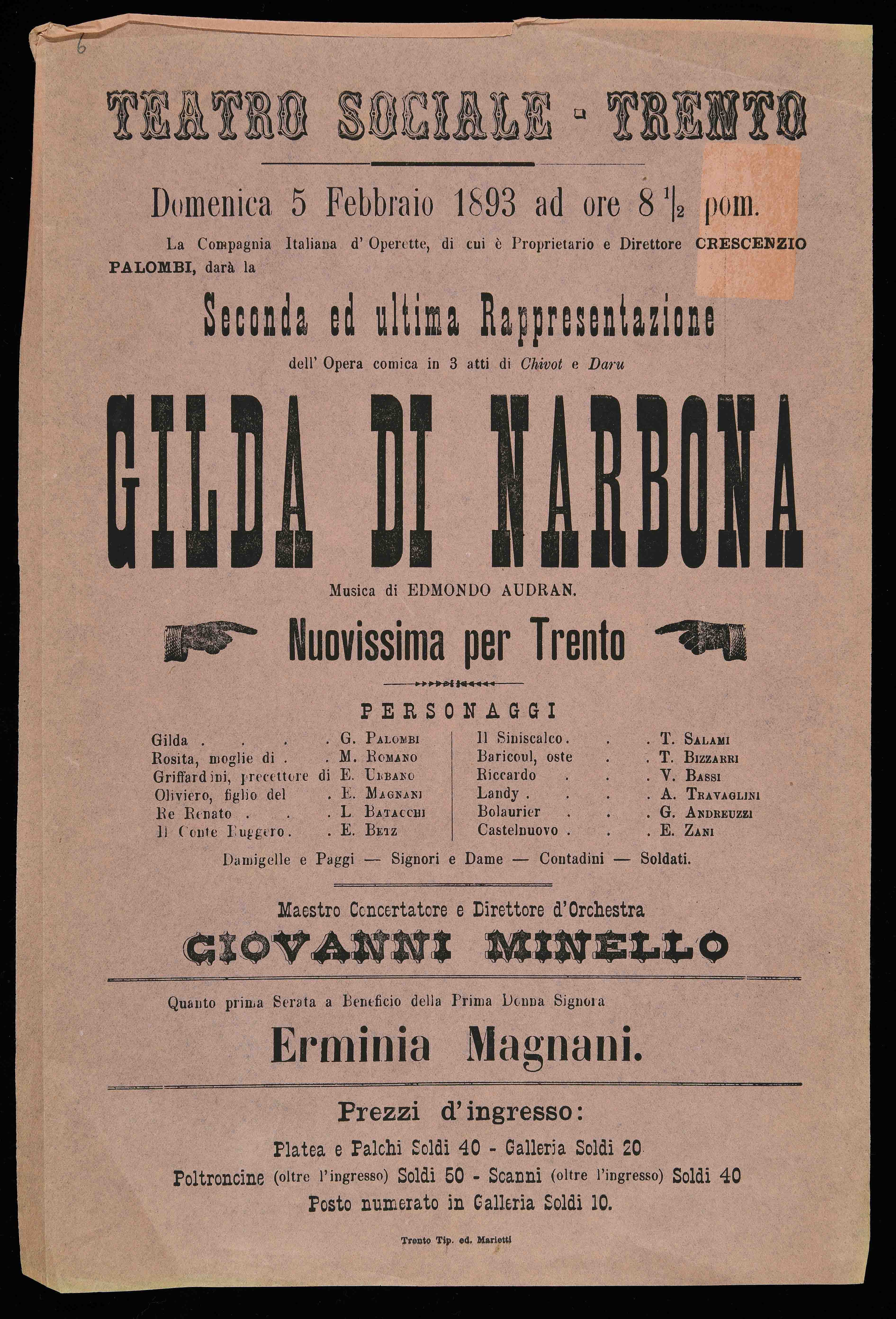 Teatro Sociale – Trento. Domenica 5 febbraio 1893 ad ore 8 ½ pom.