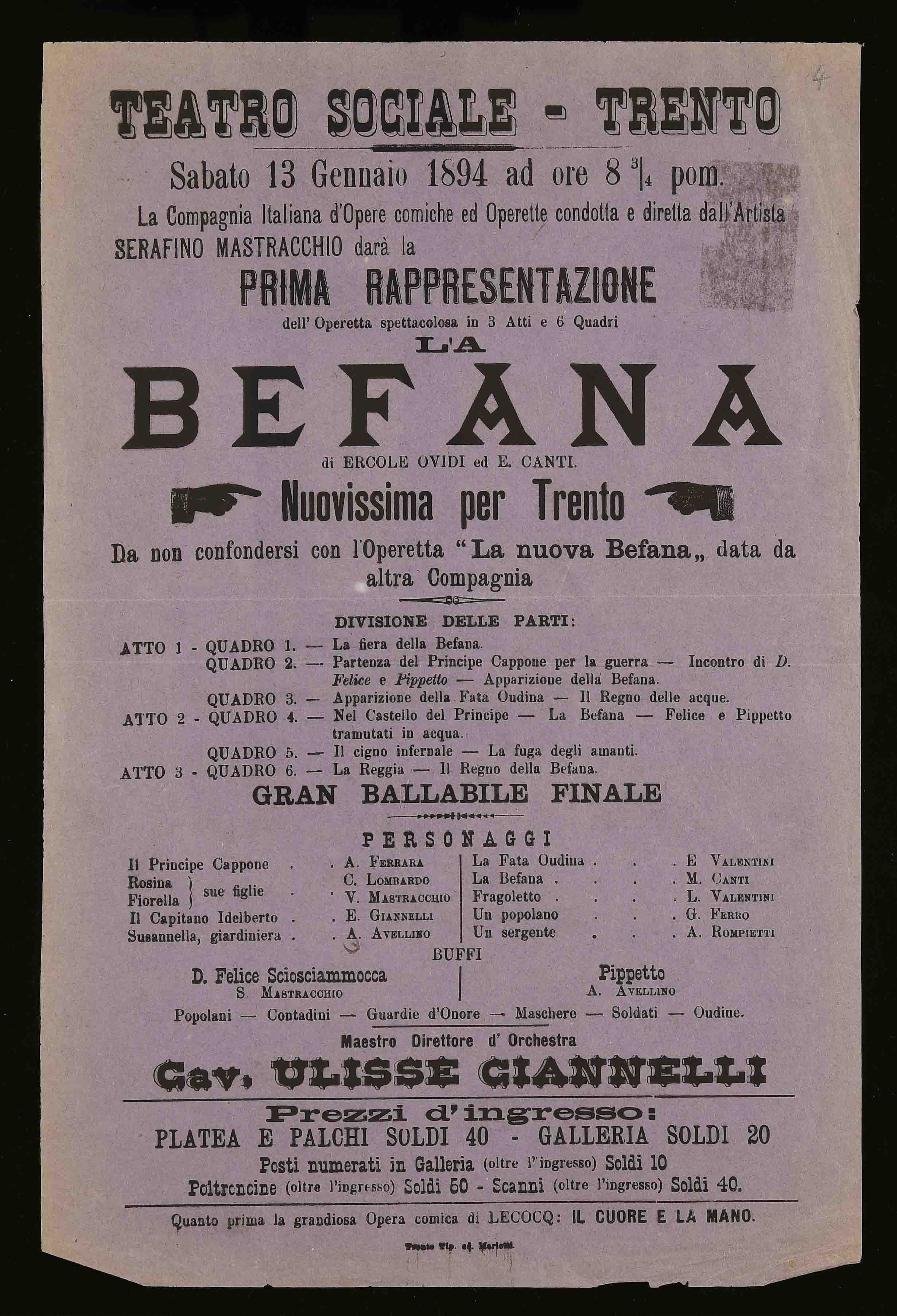Teatro Sociale – Trento. Sabato 13 gennaio 1894 ad ore 8 ¾ pom.