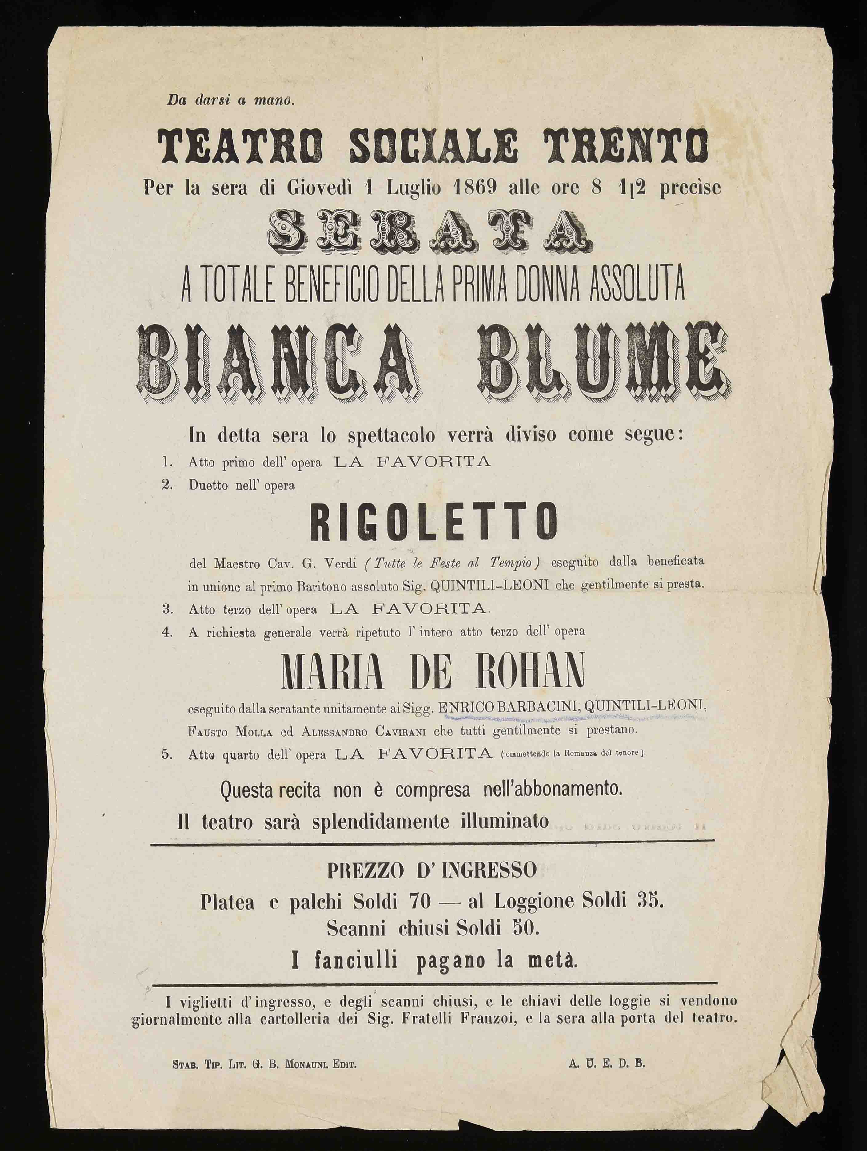 | Teatro Sociale Trento la sera di giovedì 1 luglio 1869 alle ore 8 ½ precise serata a beneficio della prima donna assoluta Bianca Blume |