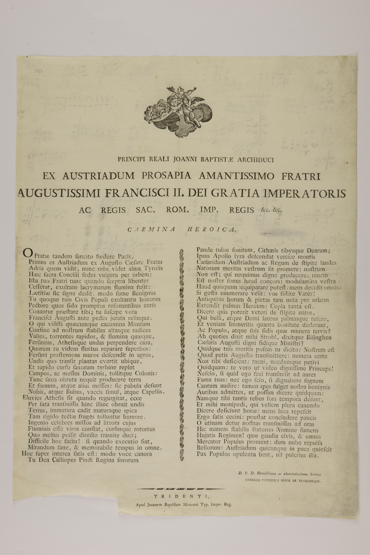 | Principi reali Joanni Baptistae archiduci ex Austriadum prosapia amantissimo fratri augustissimi Francisci II Dei gratia imperatoris ac regis Sac. Rom. Imp. regis &c. &c. Carmina heroica |