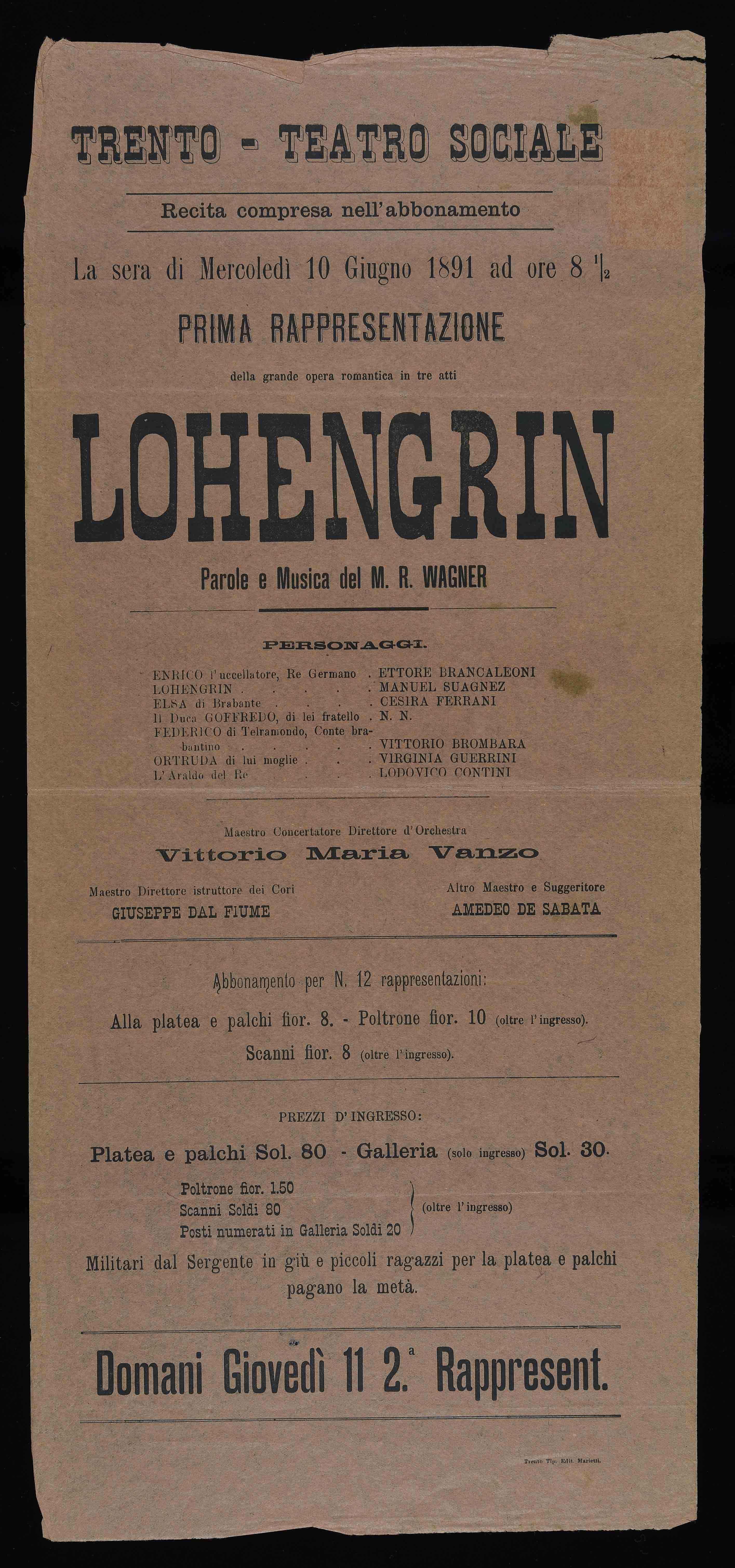 | Trento – Teatro Sociale. Recita compresa nell'abbonamento. La sera di mercoledì 10 giugno 1891 ad ore 8 ½ |