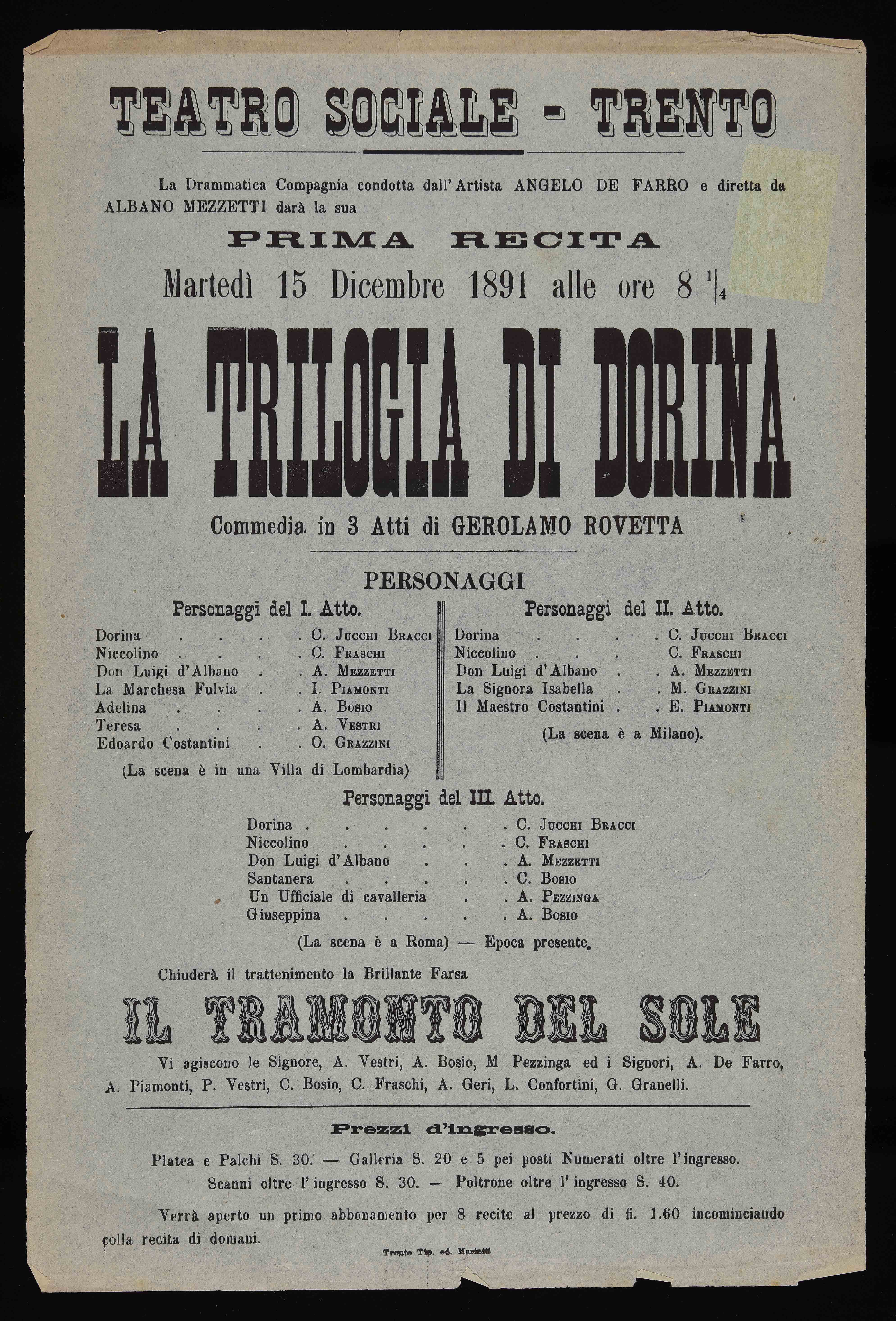 | Teatro Sociale - Trento. La drammatica compagnia condotta dall'artista Angelo De Farro e diretta da Albano Mezzetti darà la sua prima recita martedì 15 dicembre 1891 alle ore 8 ¼ |