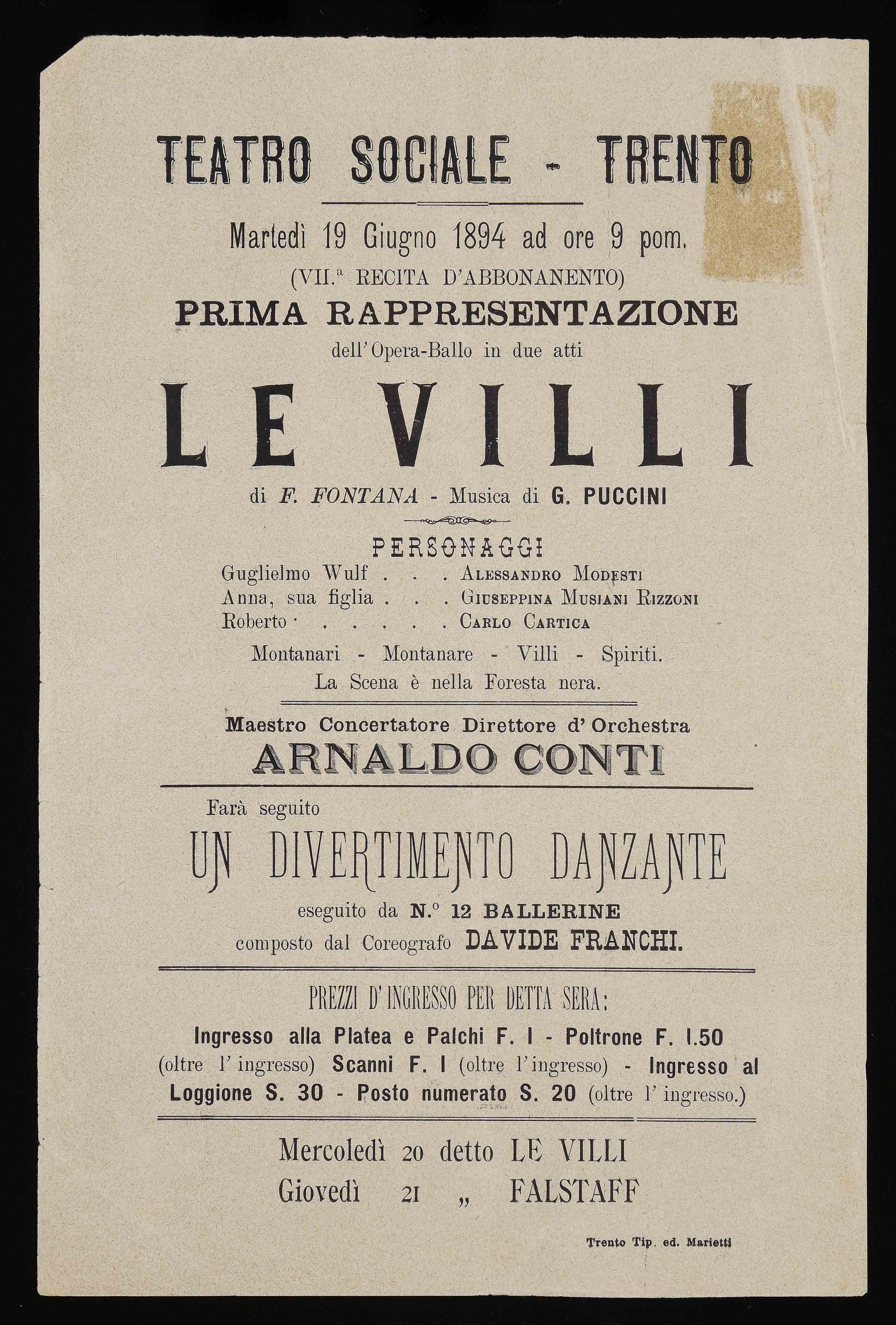 | Teatro Sociale – Trento. Martedì 19 giugno 1894 ad ore 9 pom. |