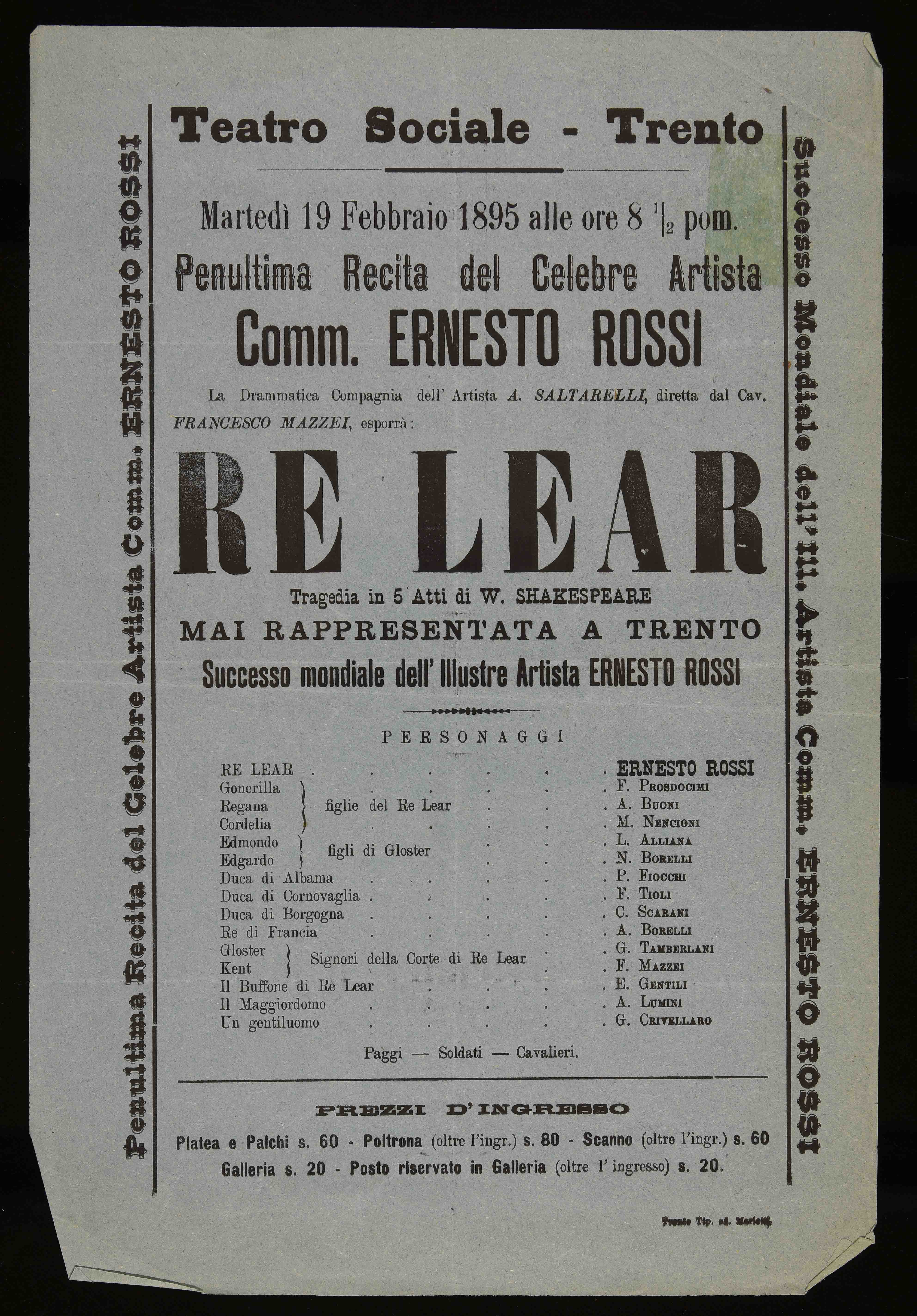 | Teatro Sociale – Trento. Martedì 19 febbraio 1895 alle ore 8 ½ pom. Penultima recita del celebre artista Comm. Ernesto Rossi |
