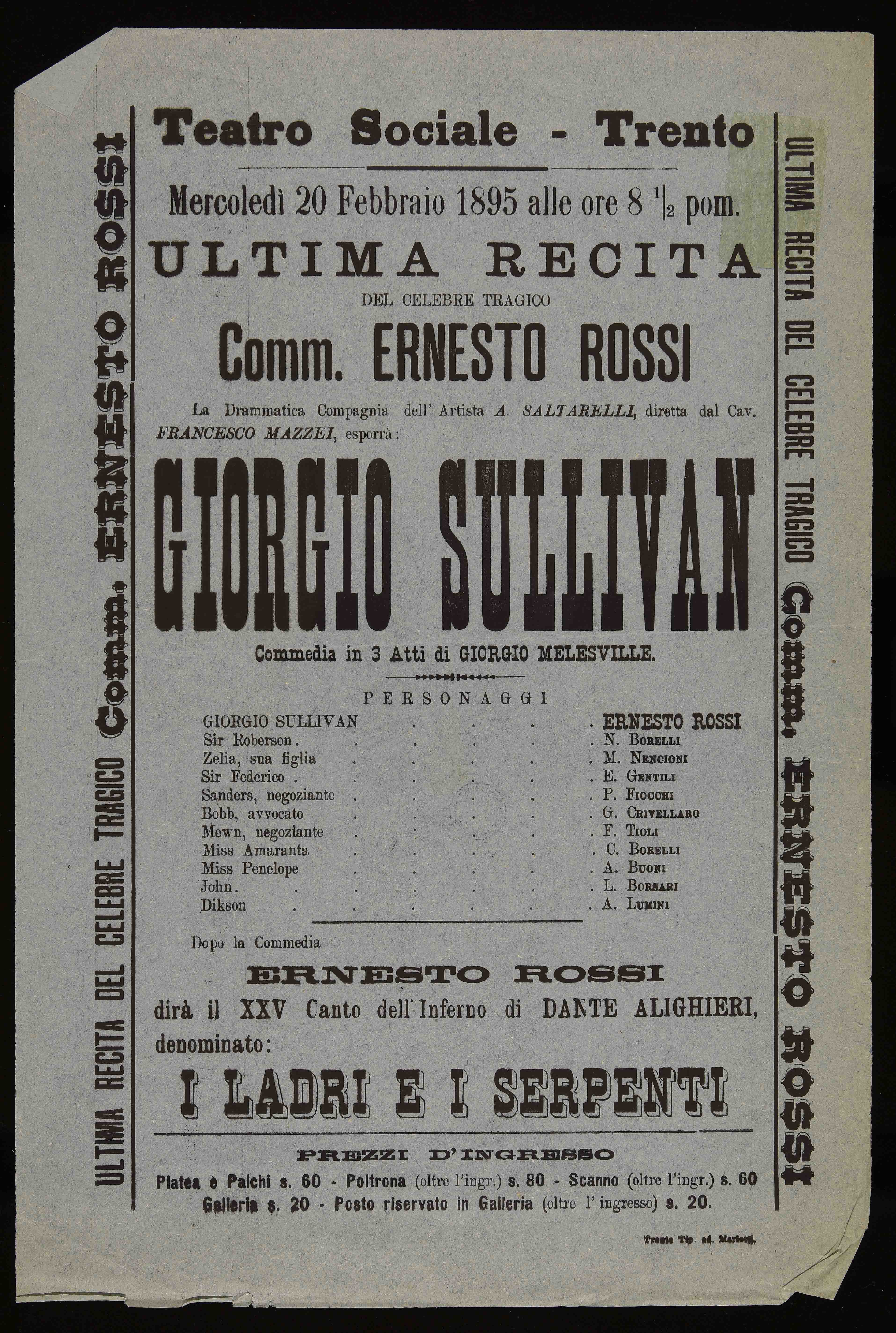 | Teatro Sociale – Trento. Mercoledì 20 febbraio 1895 alle ore 8 ½ pom. Ultima recita del celebre tragico Comm. Ernesto Rossi |