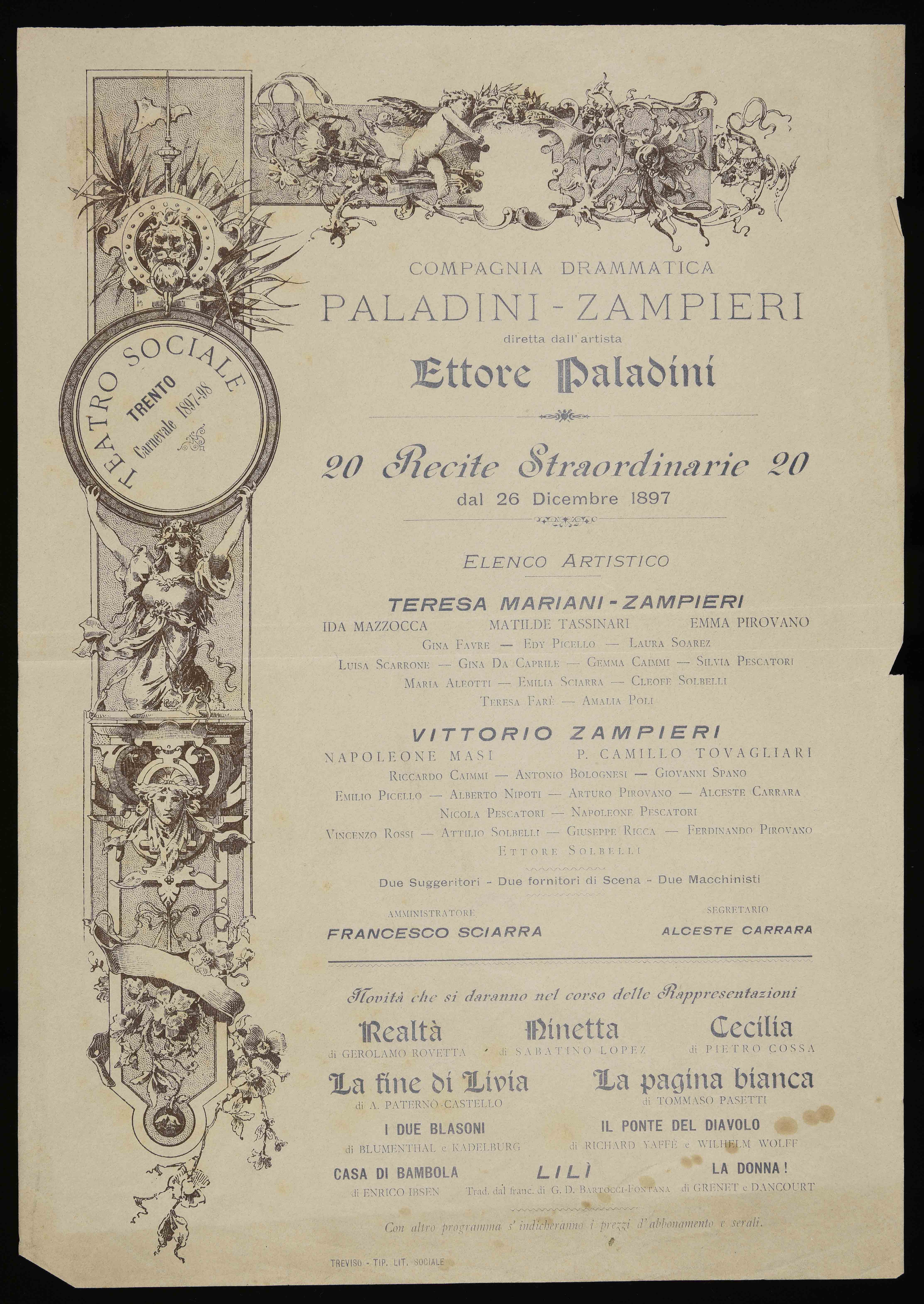 | Teatro Sociale Trento. Carnevale 1897-98. Compagnia drammatica Paladini-Zampieri diretta dall'artista Ettore Paladini |