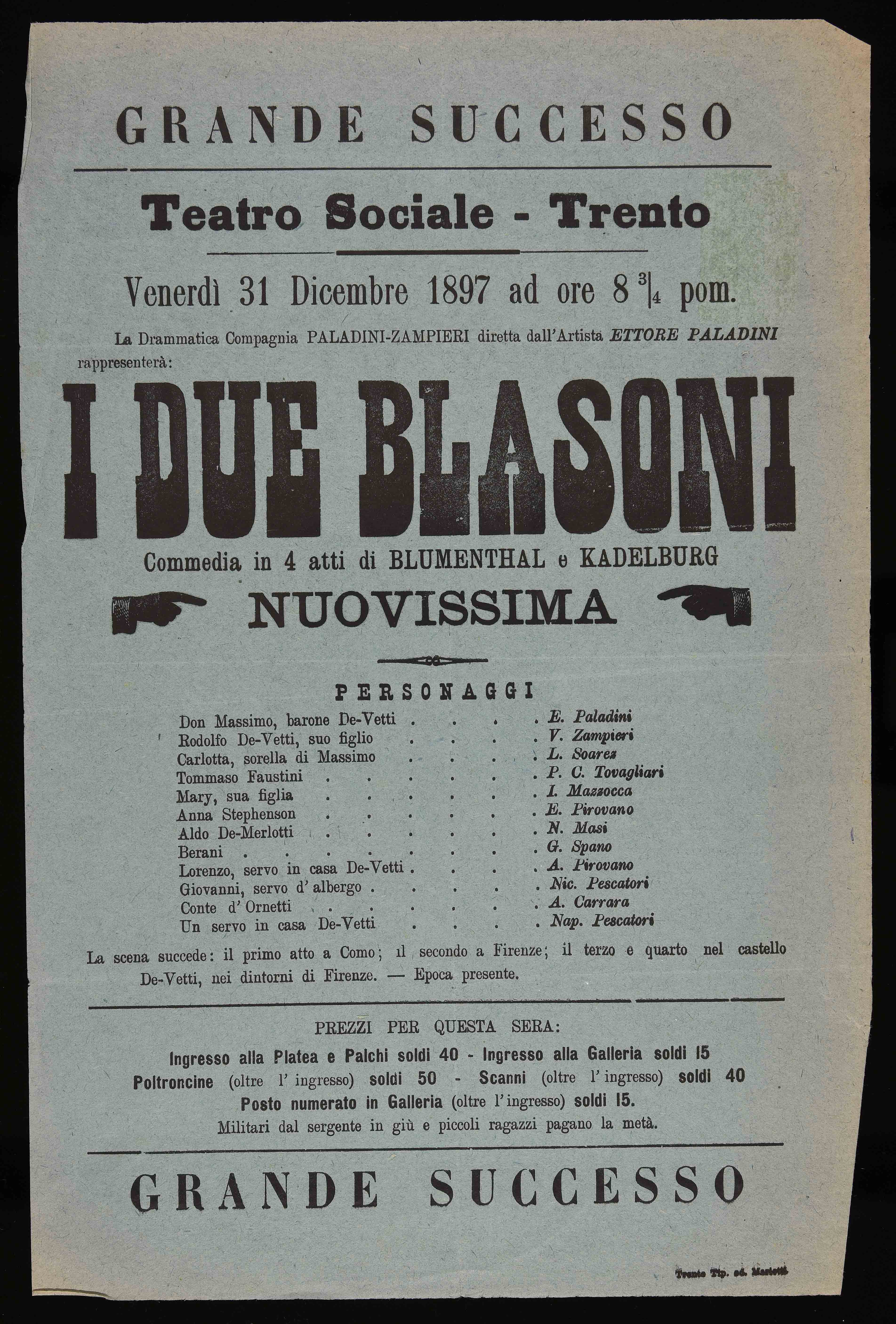 | Teatro Sociale – Trento. Venerdì 31 dicembre 1897 ad ore 8 ¾ pom. |