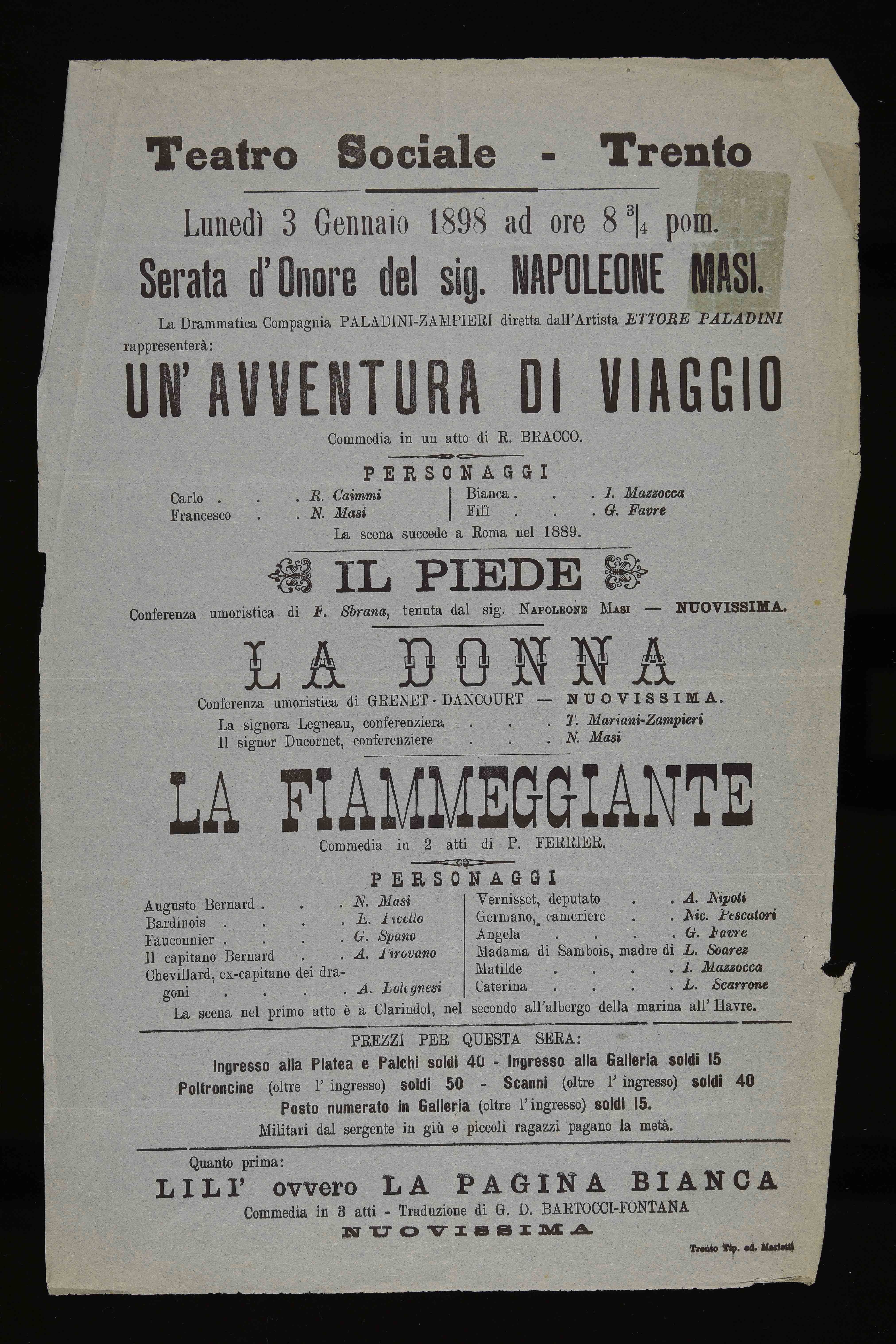 | Teatro Sociale – Trento. Lunedì 3 gennaio 1898 ad ore 8 ¾ pom. |