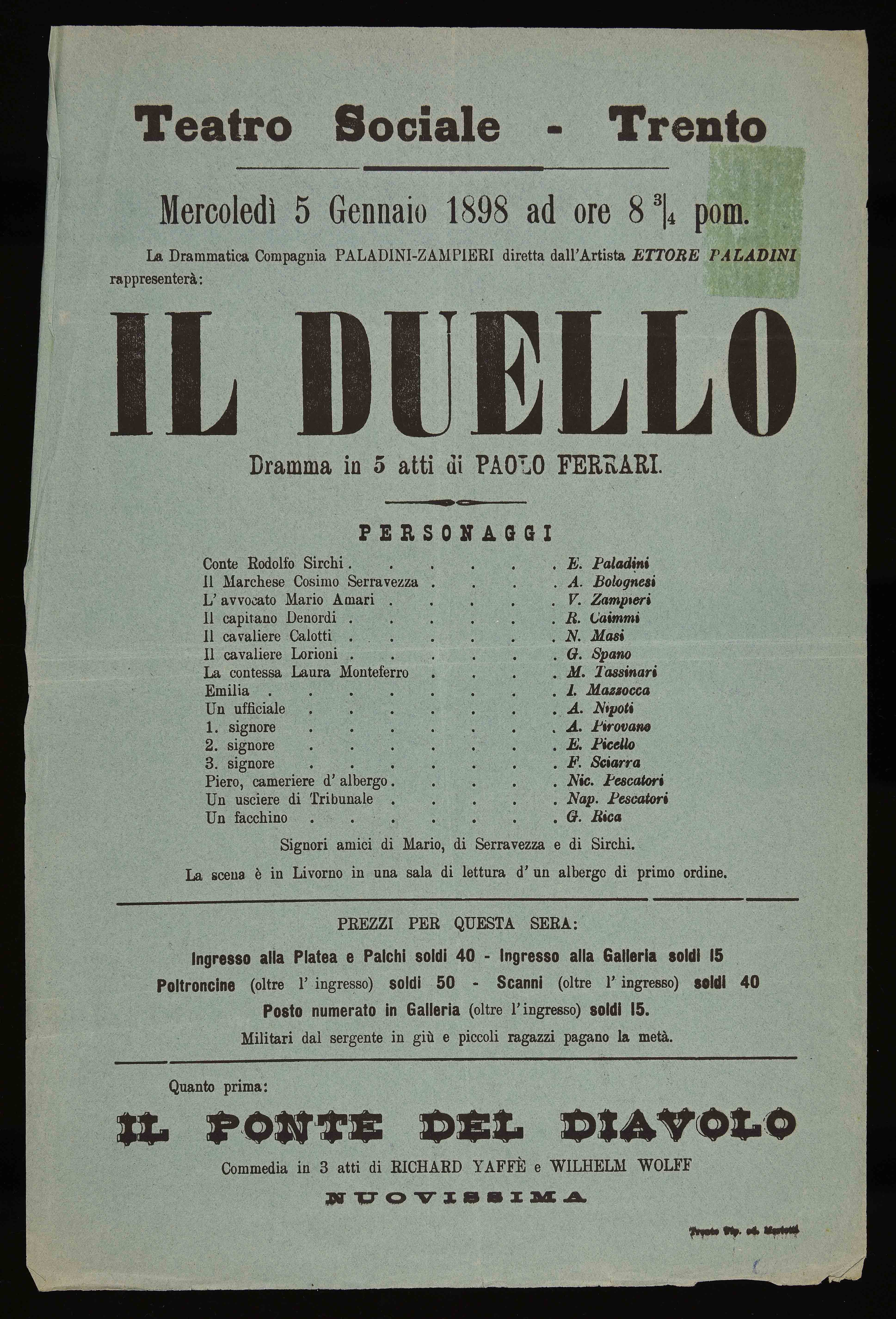Teatro Sociale – Trento. Mercoledì 5 gennaio 1898 ad ore 8 ¾ pom.