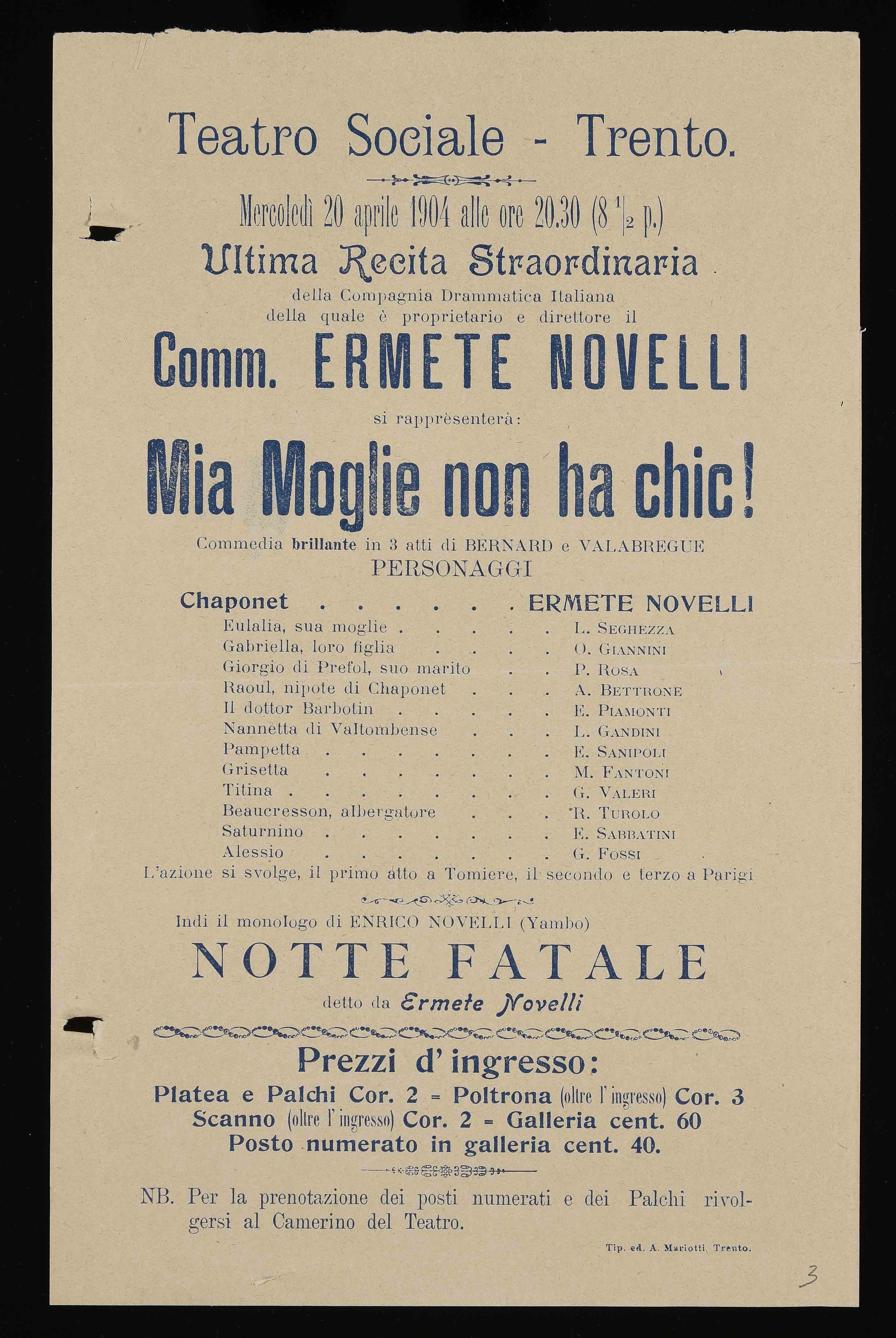 Teatro Sociale – Trento. Mercoledì 20 aprile 1904 alle ore 20.30 (8 ½ p.)