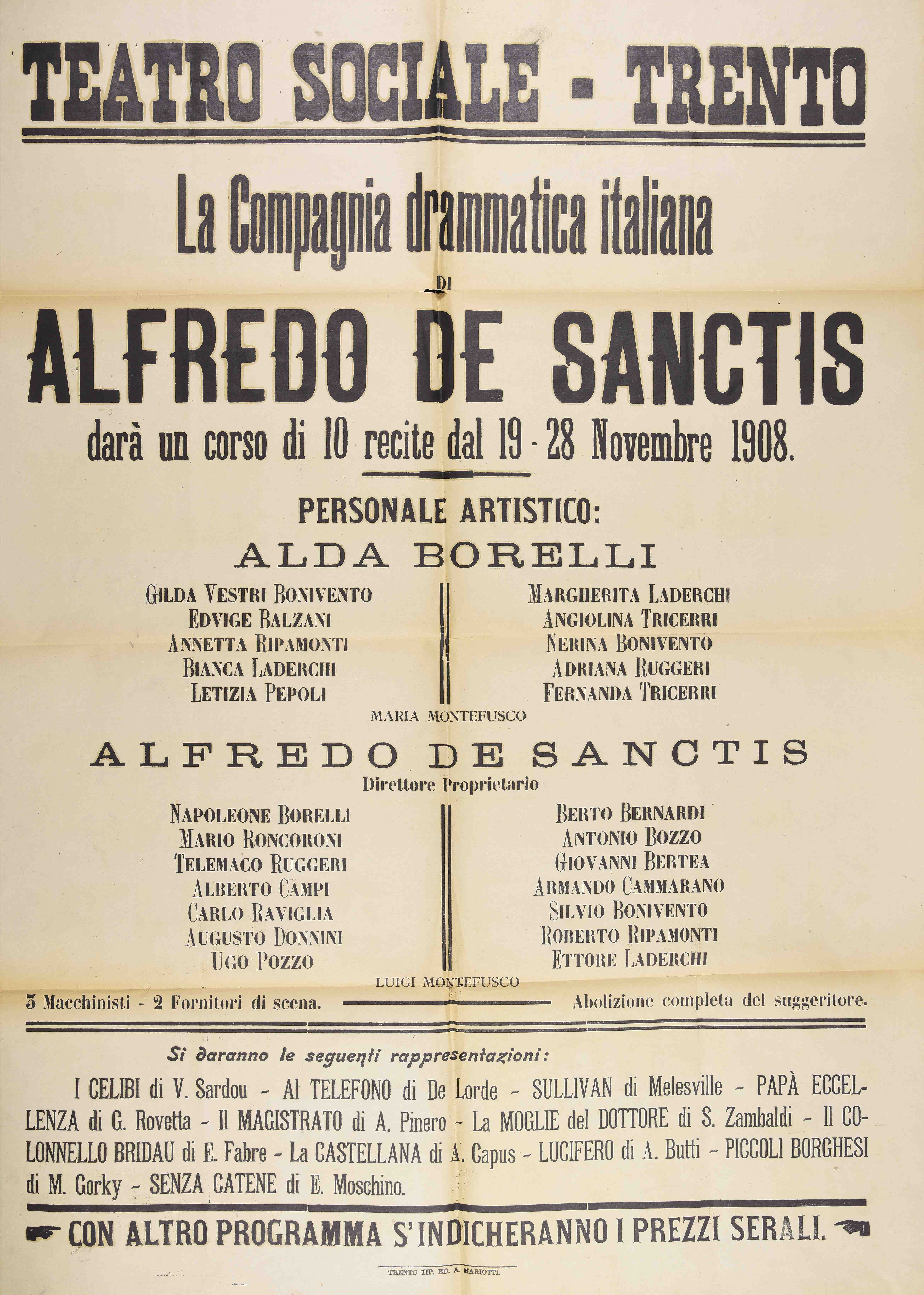 | Teatro Sociale – Trento. La Compagnia drammatica di Alfredo De Sanctis darà un corso di 10 recite dal 19-28 novembre 1908 |