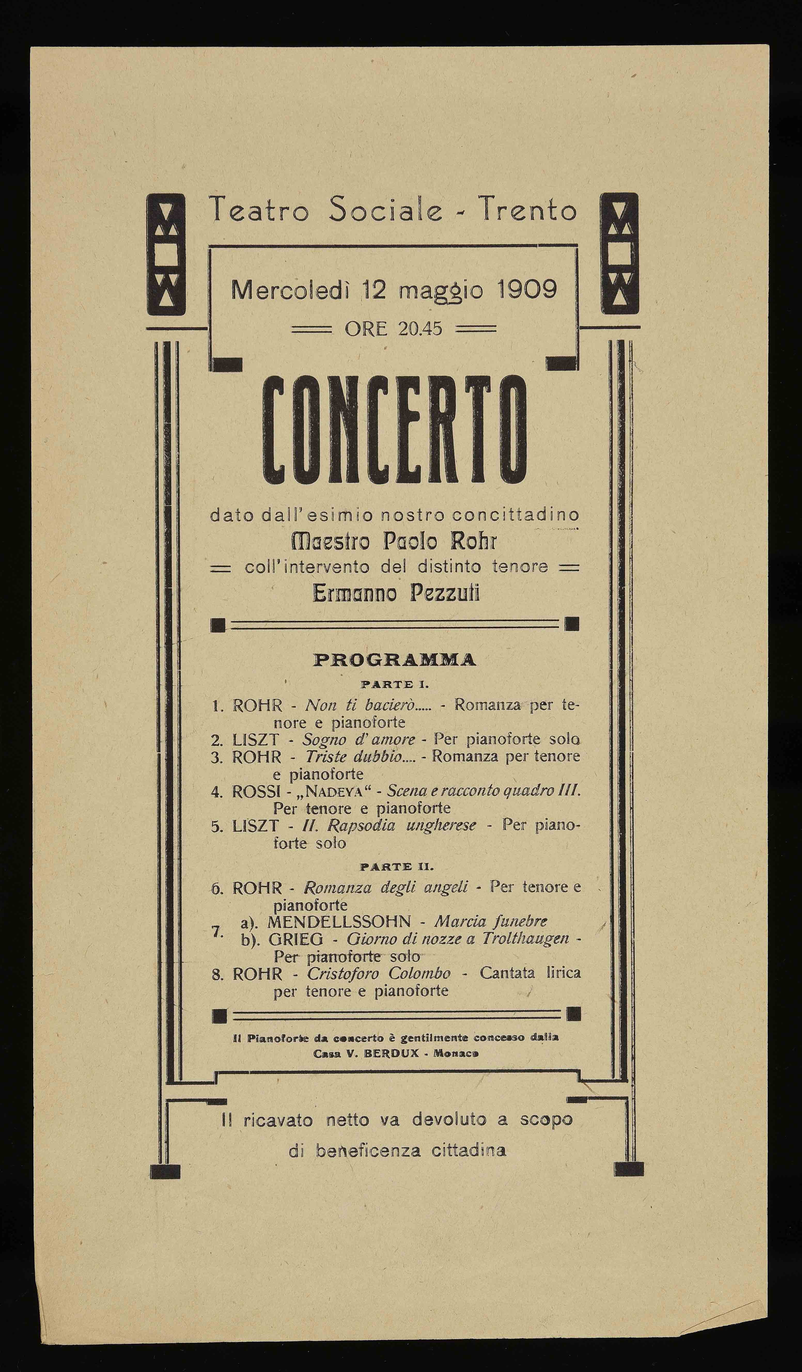 | Teatro Sociale Trento. Mercoledì 12 maggio 1909 ore 20.45. Concerto dato dall'esimio nostro concittadino Maestro Paolo Rohr |