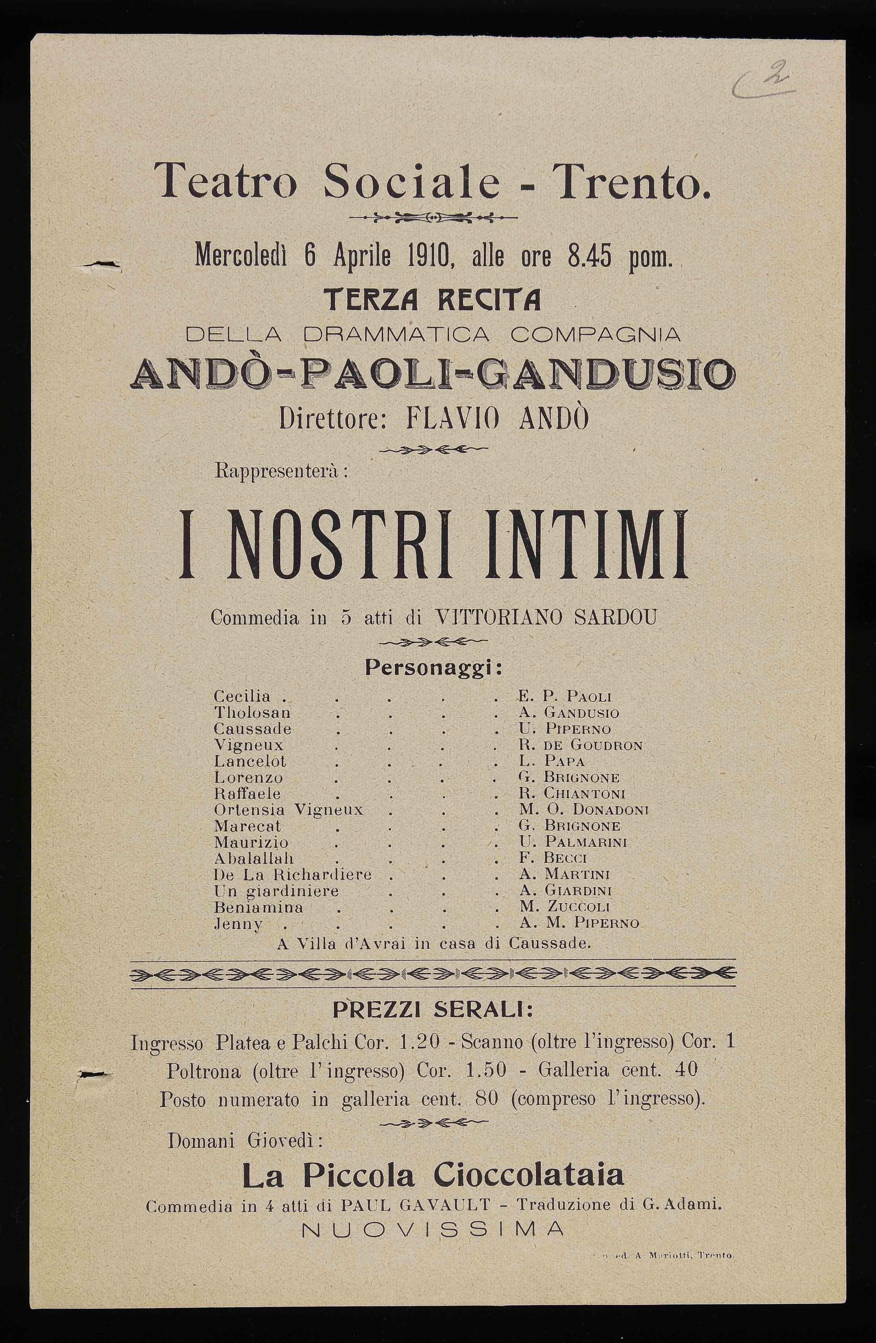 Teatro Sociale – Trento. Mercoledì 6 aprile 1910, alle ore 8.45 pom.