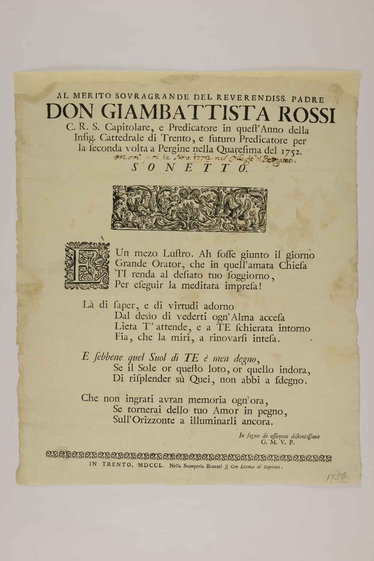 | Al merito sovragrande del reverendiss. padre don Giambattista Rossi c.r.s. capitolare, e predicatore in quest'anno della insig. cattedrale di Trento, e futuro predicatore per la seconda volta a Pergine nella quaresima del 1752. Sonetto |