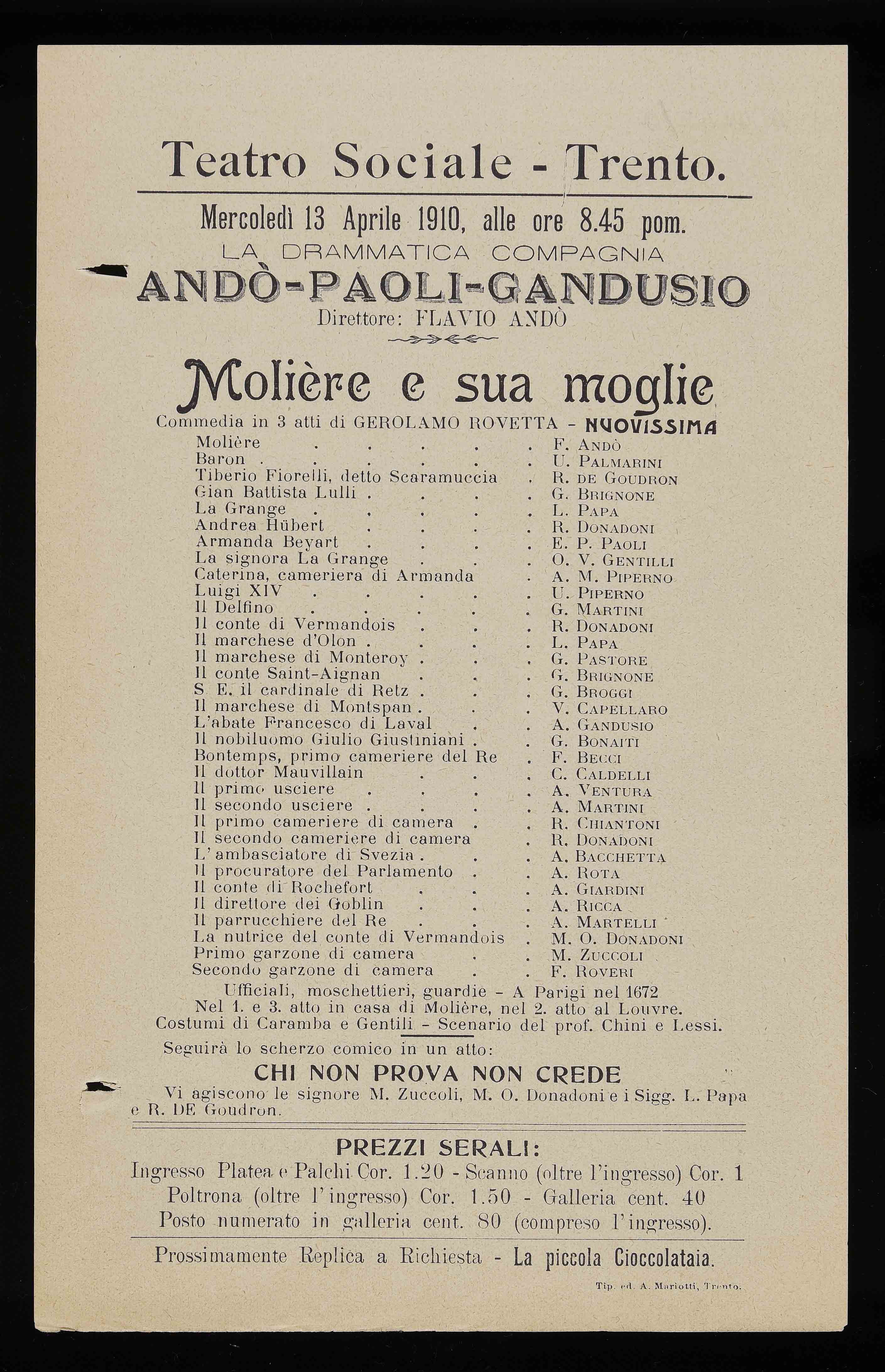 Teatro Sociale – Trento. Mercoledì 13 aprile 1910, alle ore 8.45 pom.