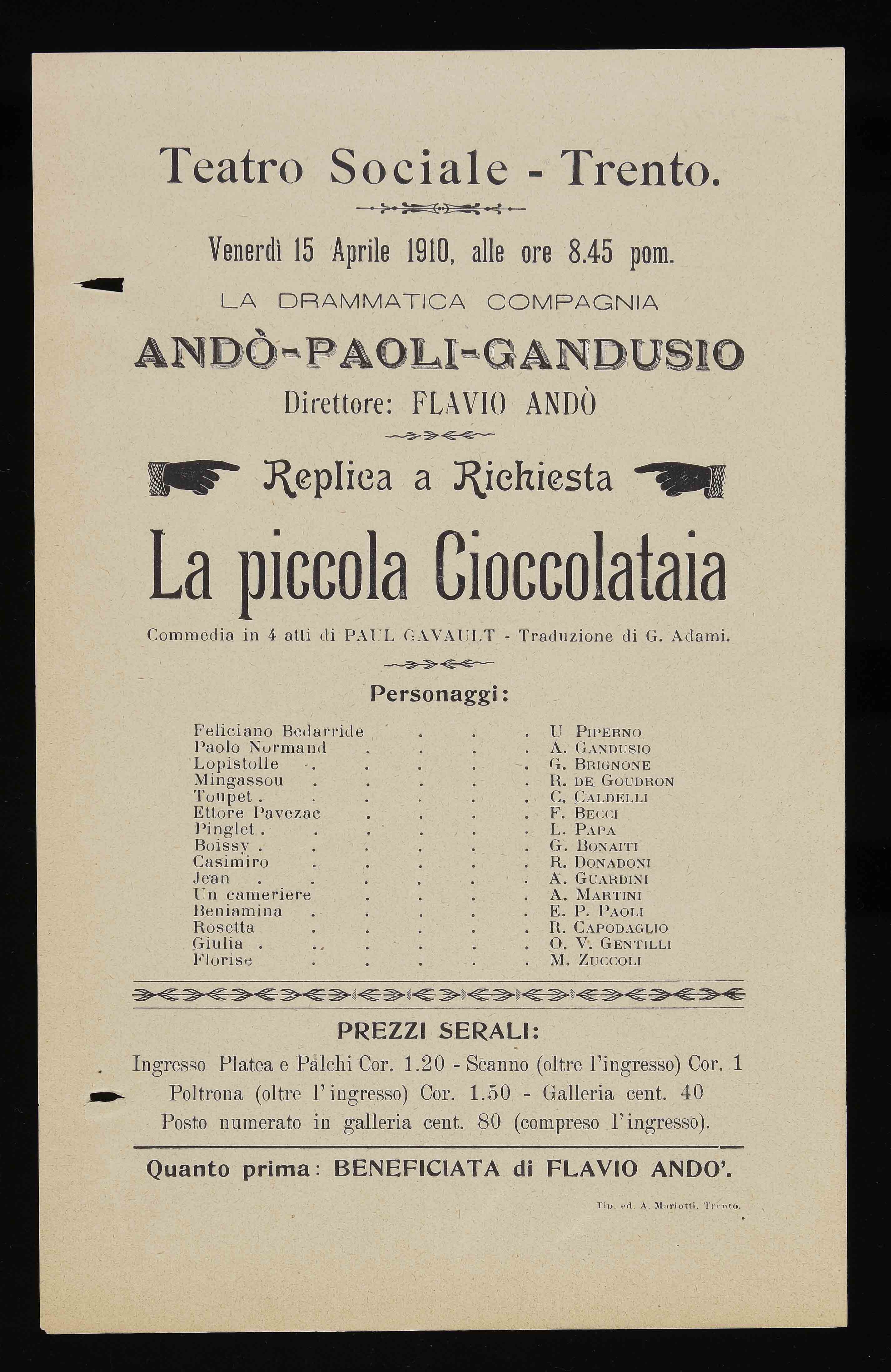 Teatro Sociale – Trento. Venerdì 15 aprile 1910, alle ore 8.45 pom.