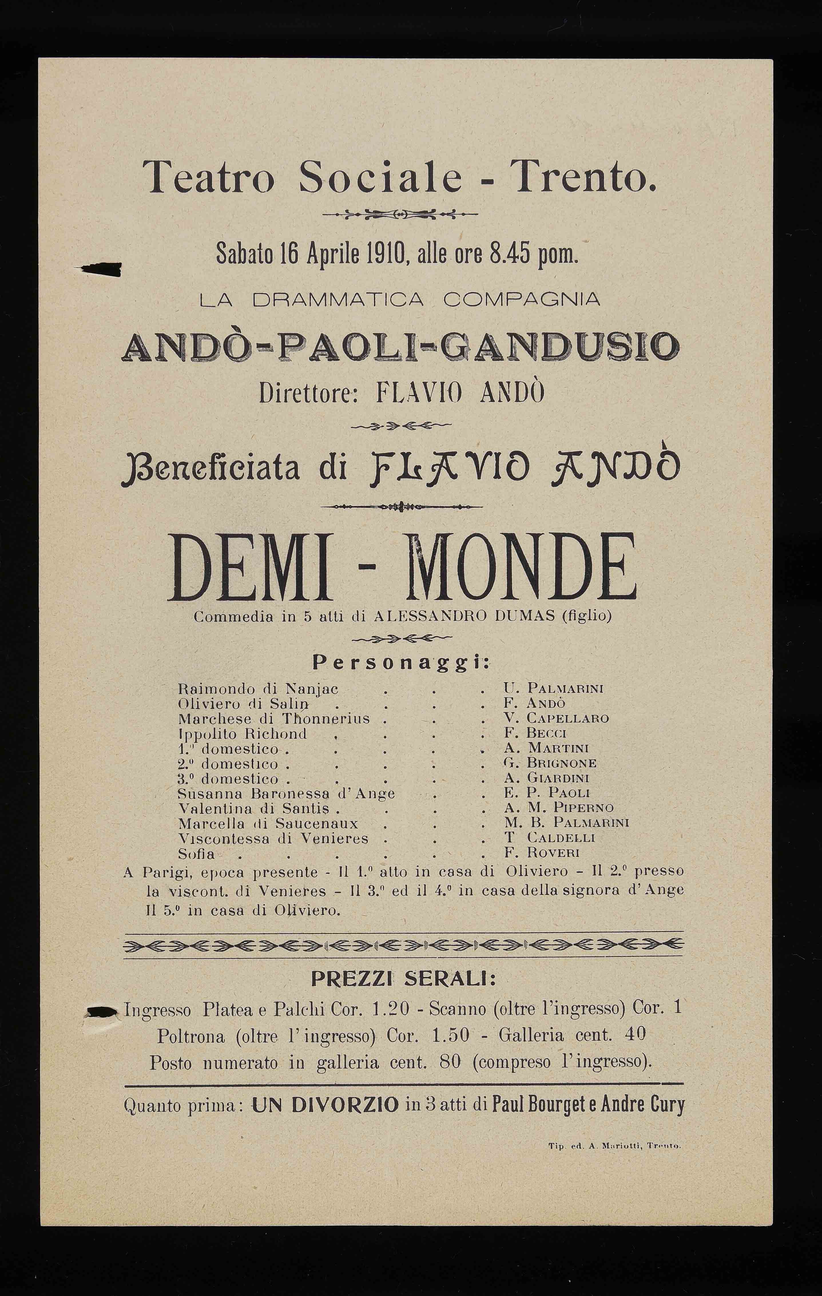 | Teatro Sociale – Trento. Sabato 16 aprile 1910, alle ore 8.45 pom. |