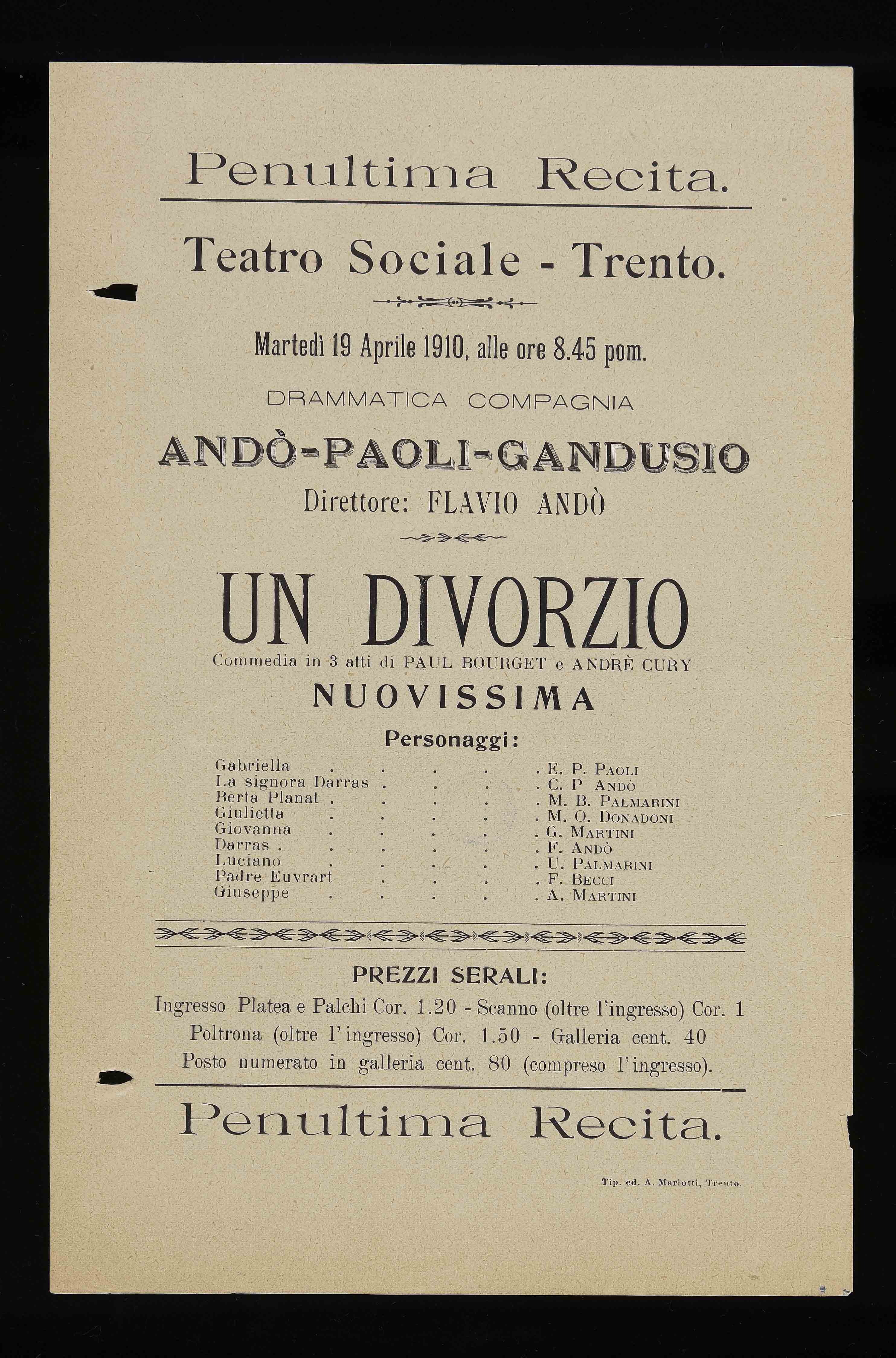 Teatro Sociale – Trento. Martedì 19 aprile 1910, alle ore 8.45 pom.
