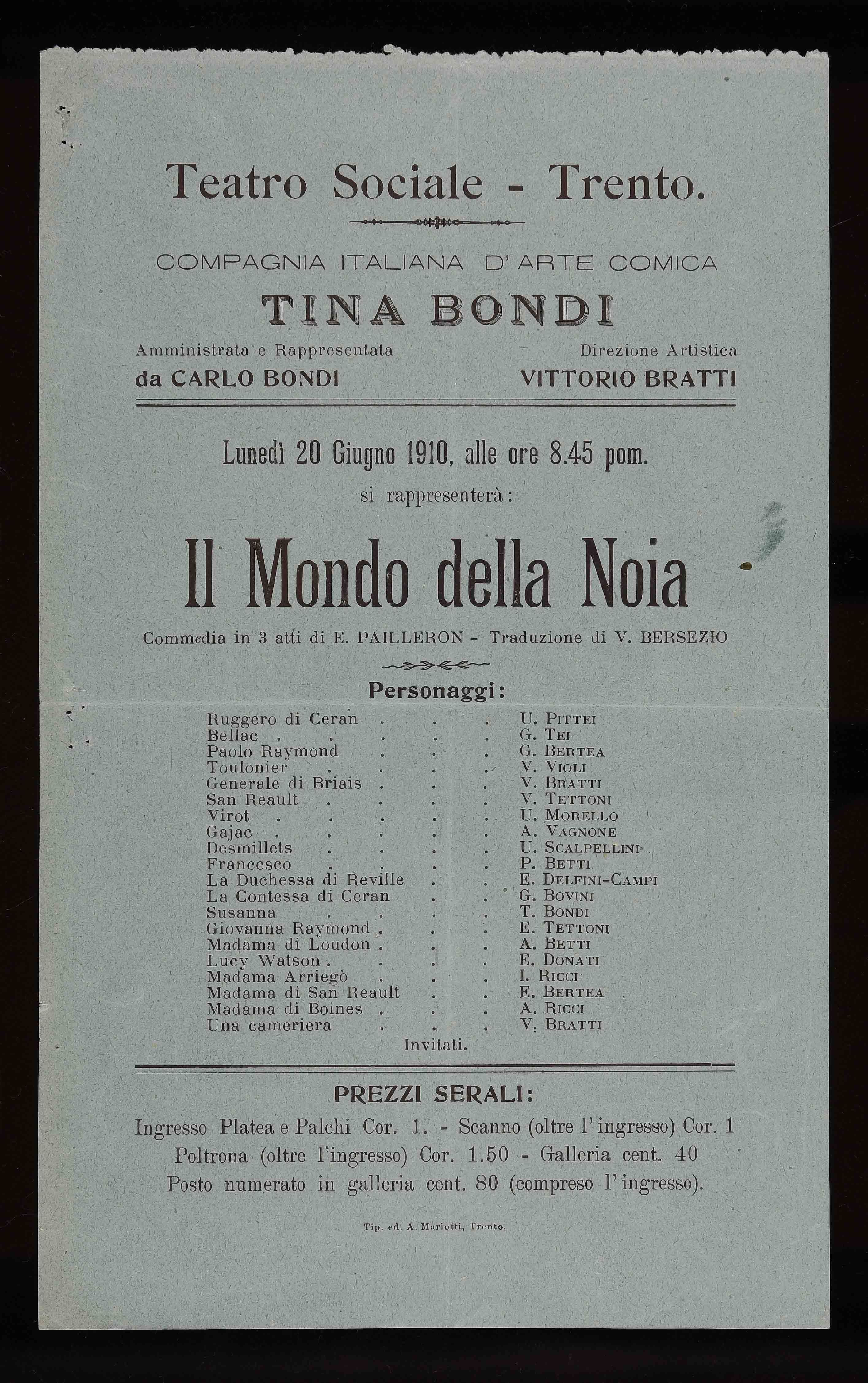 Teatro Sociale – Trento. Lunedì 20 giugno 1910, alle ore 8.45 pom.