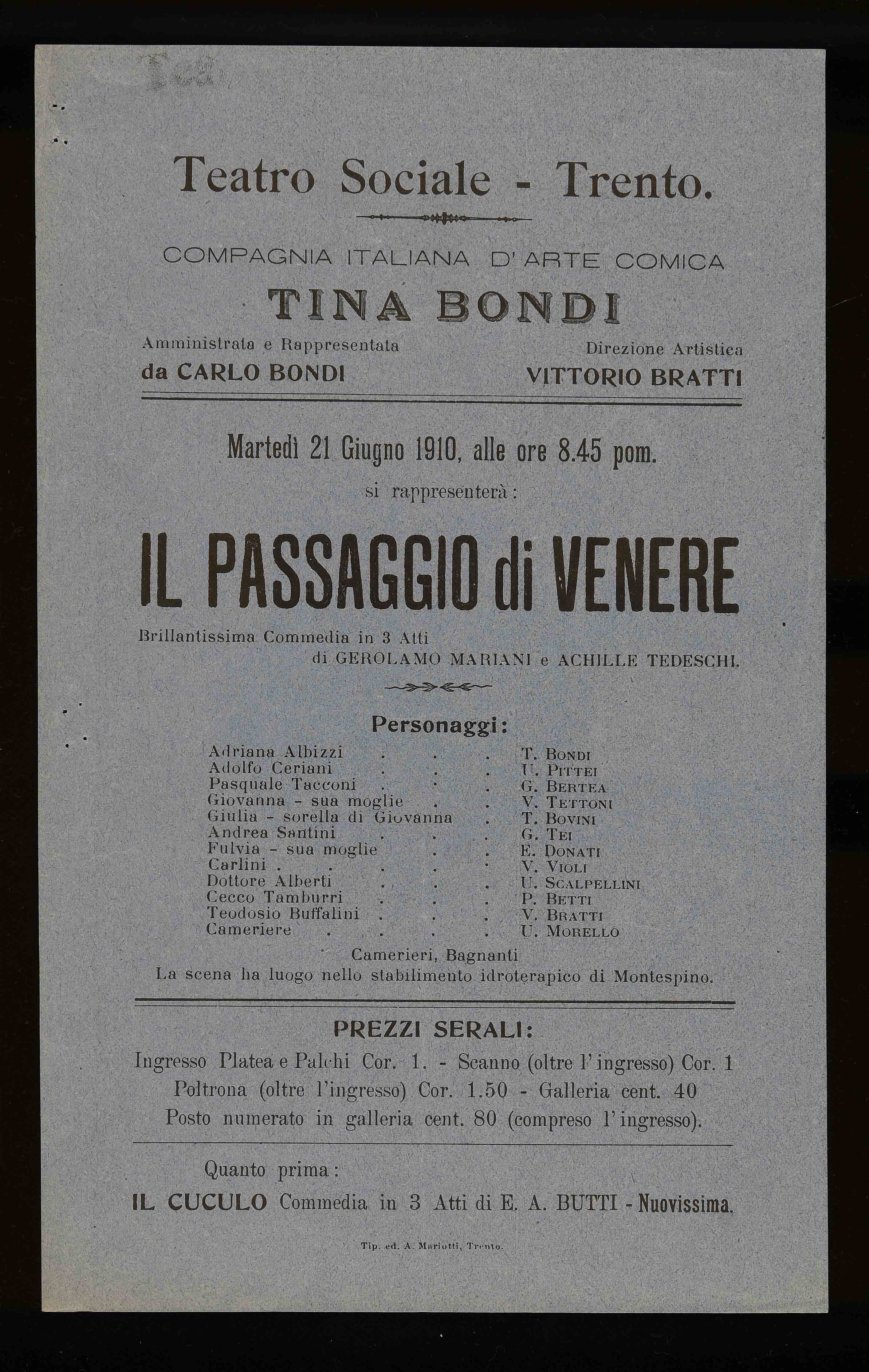 Teatro Sociale – Trento. Martedì 21 giugno 1910, alle ore 8.45 pom.
