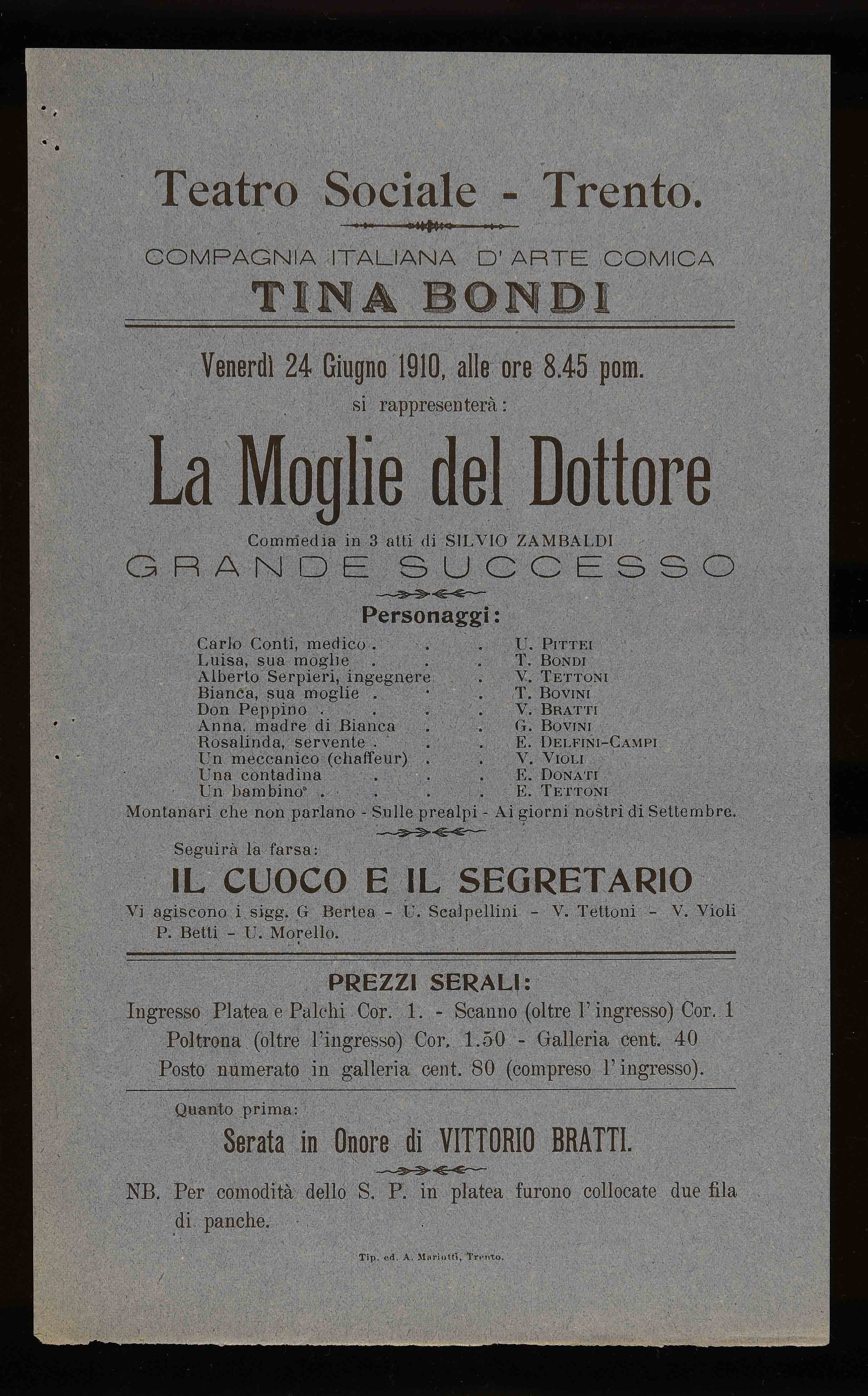 Teatro Sociale – Trento. Venerdì 24 giugno 1910, alle ore 8.45 pom.