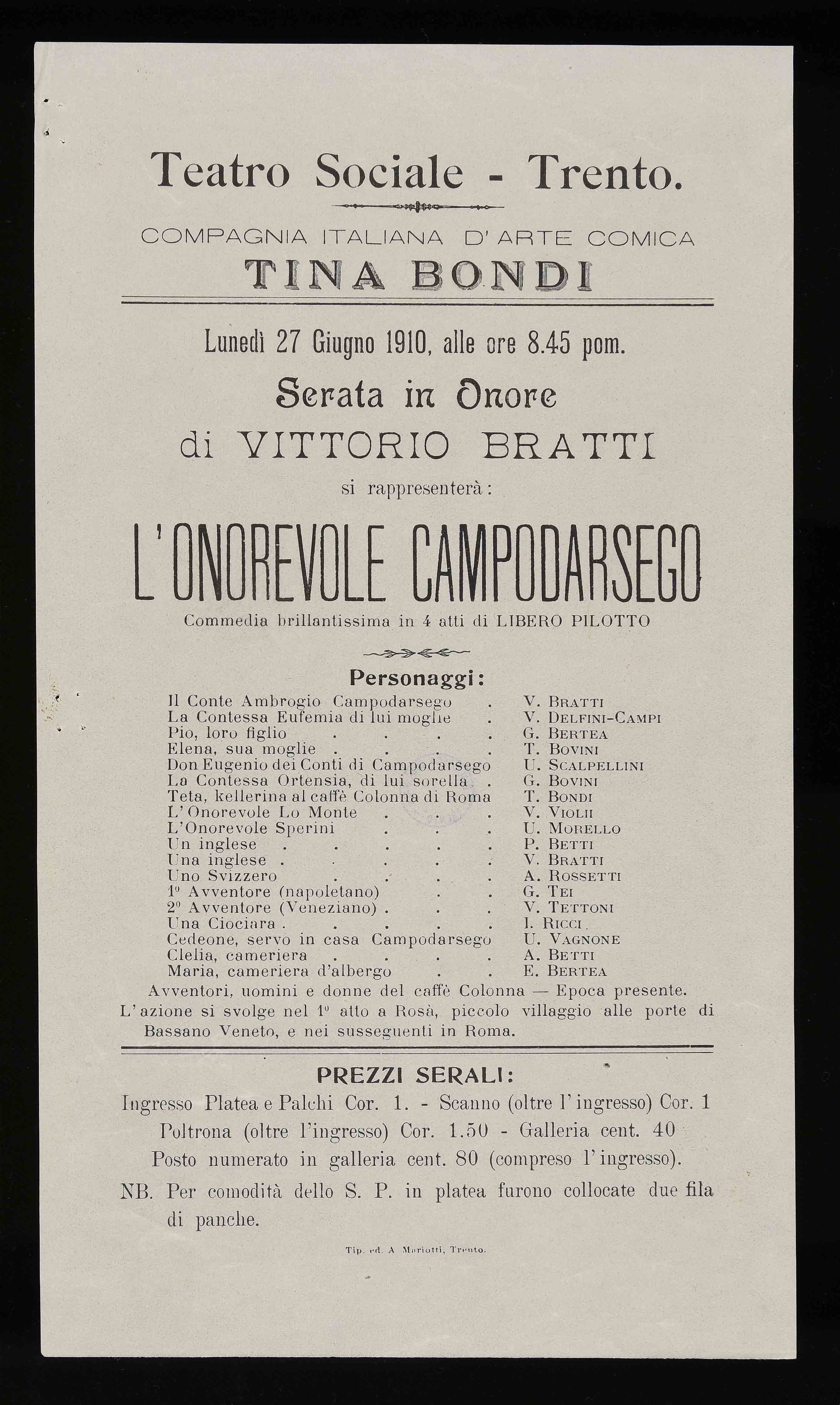 Teatro Sociale – Trento. Lunedì 27 giugno 1910, alle ore 8.45 pom.
