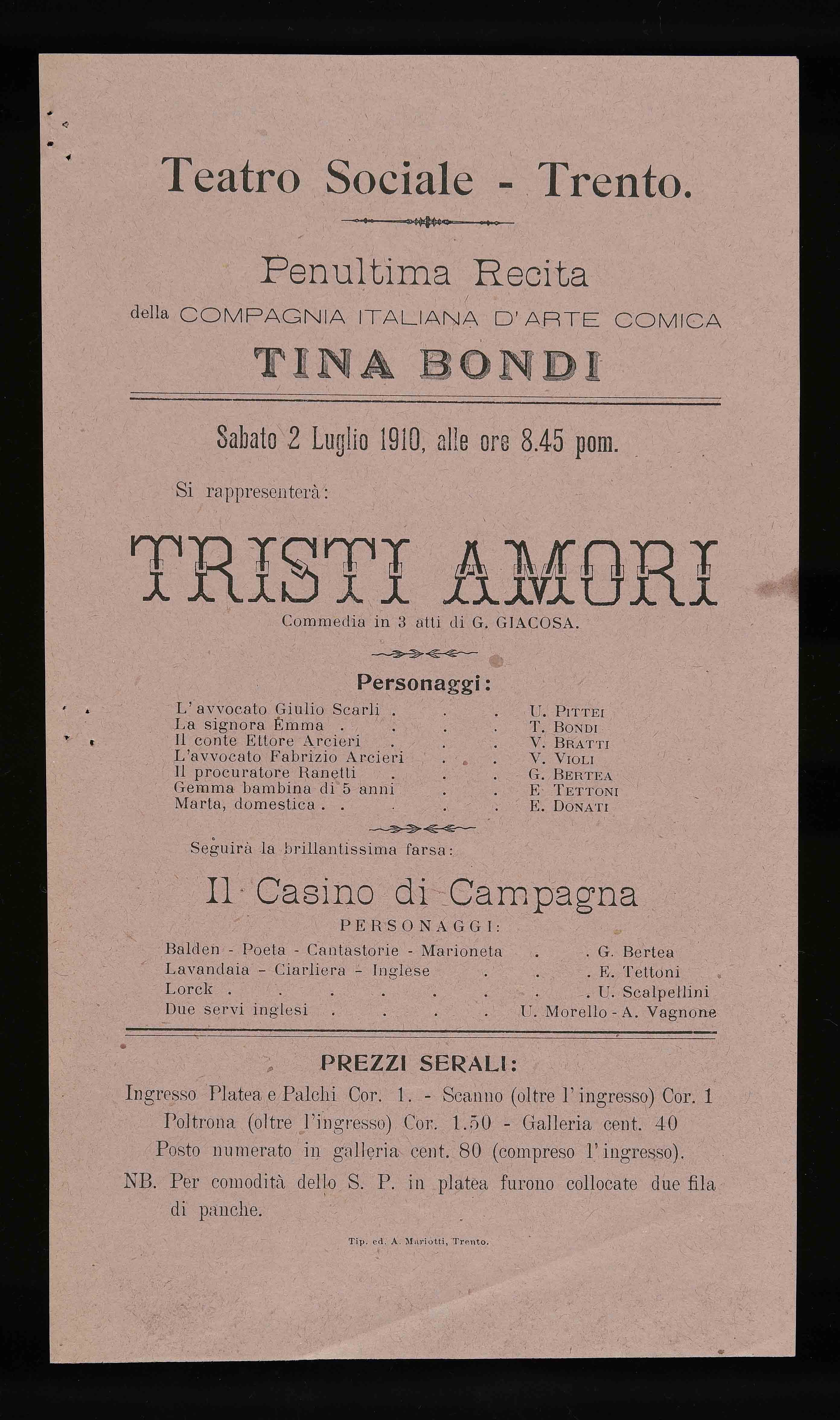 | Teatro Sociale – Trento. Sabato 2 luglio 1910, alle ore 8.45 pom. |