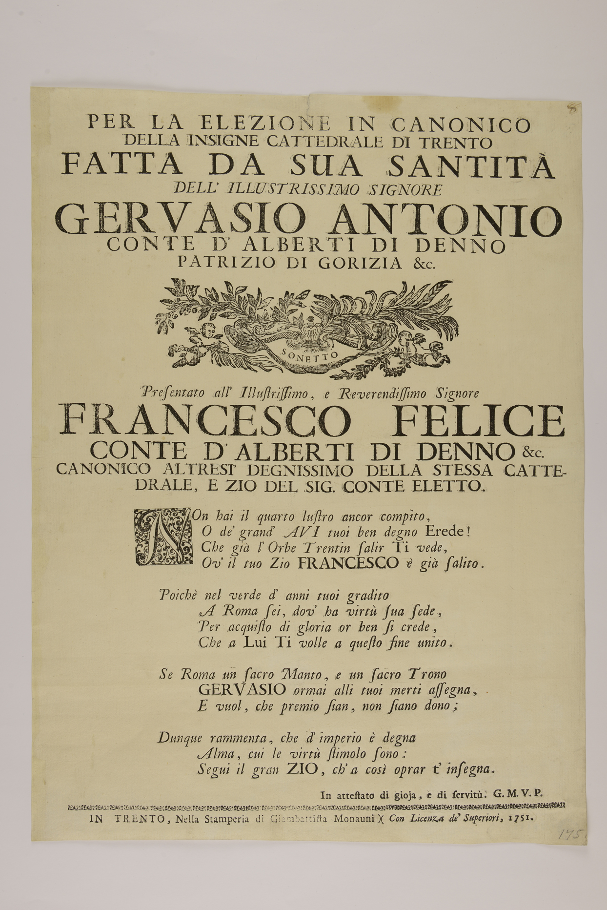 | Per la elezione in canonico della insigne cattedrale di Trento fatta da sua santità dell'illustrissimo signore Gervasio Antonio conte d'Alberti di Denno patrizio di Gorizia &c. Sonetto |