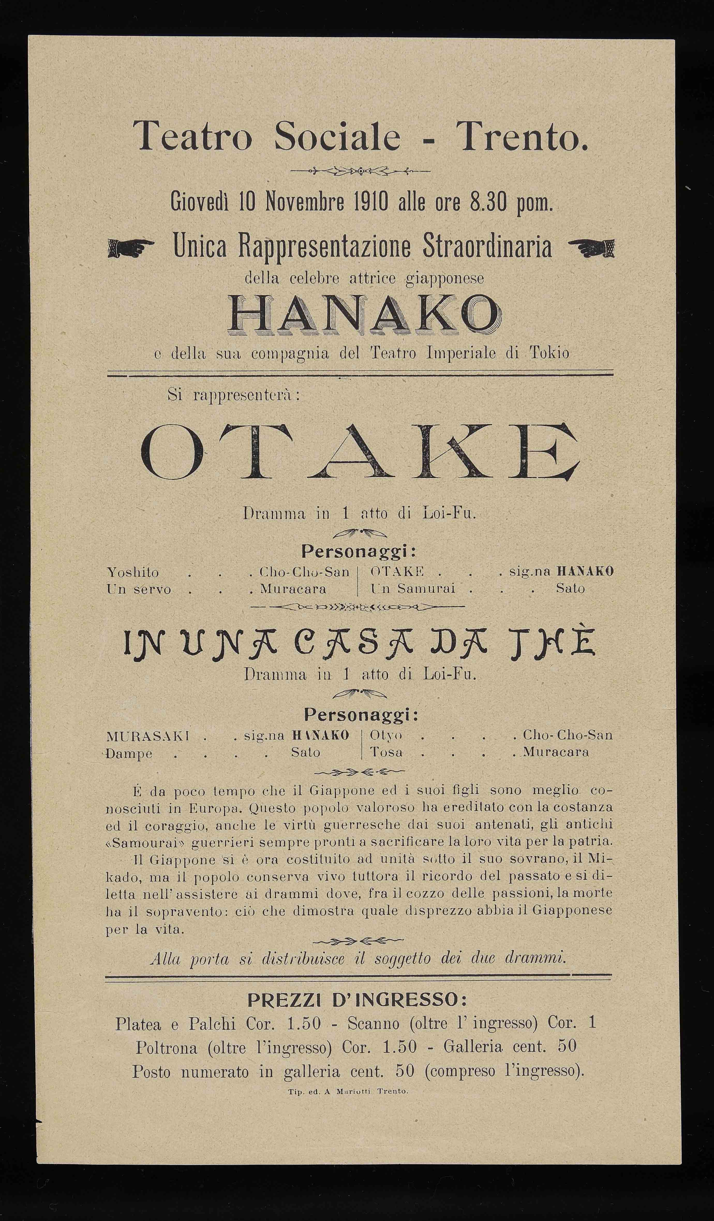 Teatro Sociale – Trento. Giovedì 10 novembre 1910 alle ore 8.30 pom.