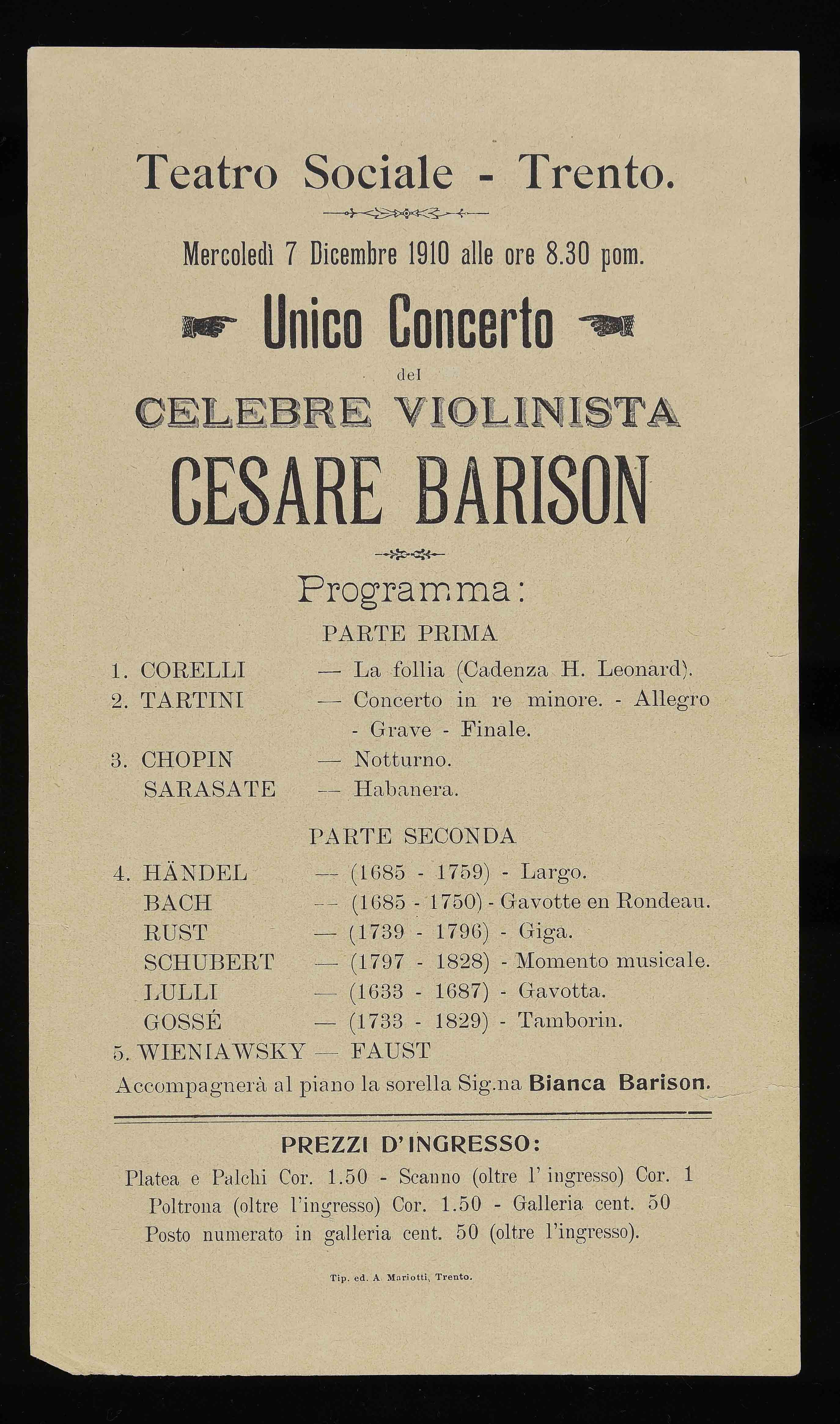 | Teatro Sociale – Trento. Mercoledì 7 dicembre 1910 alle ore 8.30 pom. Unico concerto del celebre violinista Cesare Barison |