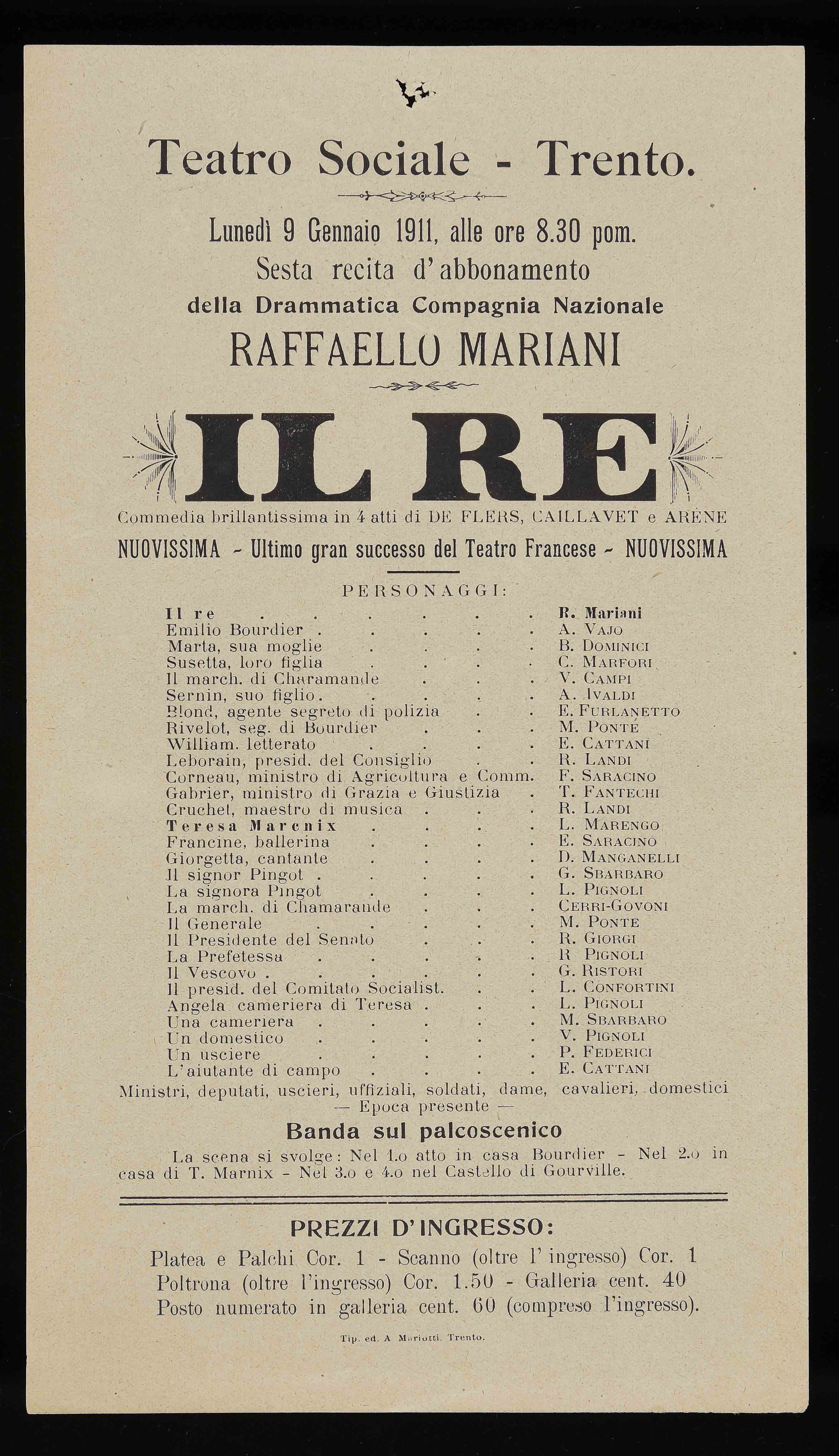Teatro Sociale – Trento. Lunedì 9 gennaio 1911, alle ore 8.30 pom.