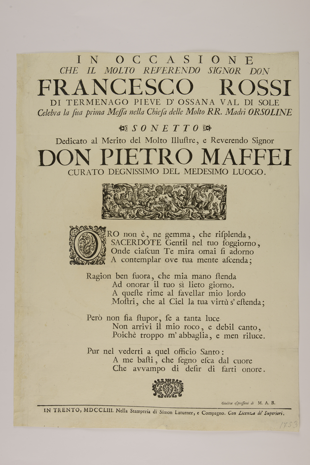 | In occasione che il molto reverendo signor don Francesco Rossi di Termenago pieve d'Ossana Val di Sole celebra la sua prima messa nella chiesa delle molto rr. Madri Orsoline sonetto |