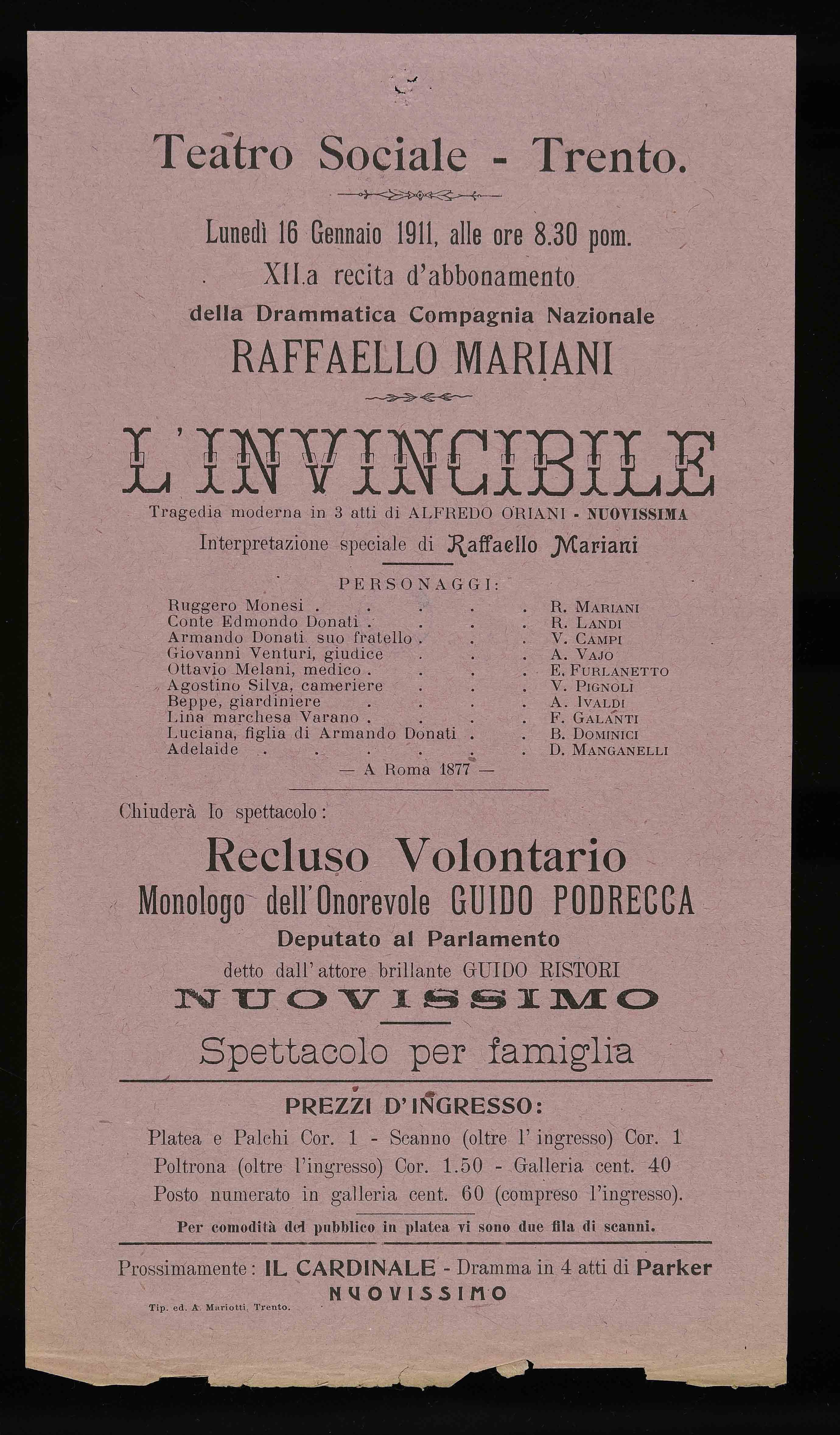 Teatro Sociale – Trento. Lunedì 16 gennaio 1911, alle ore 8.30 pom.