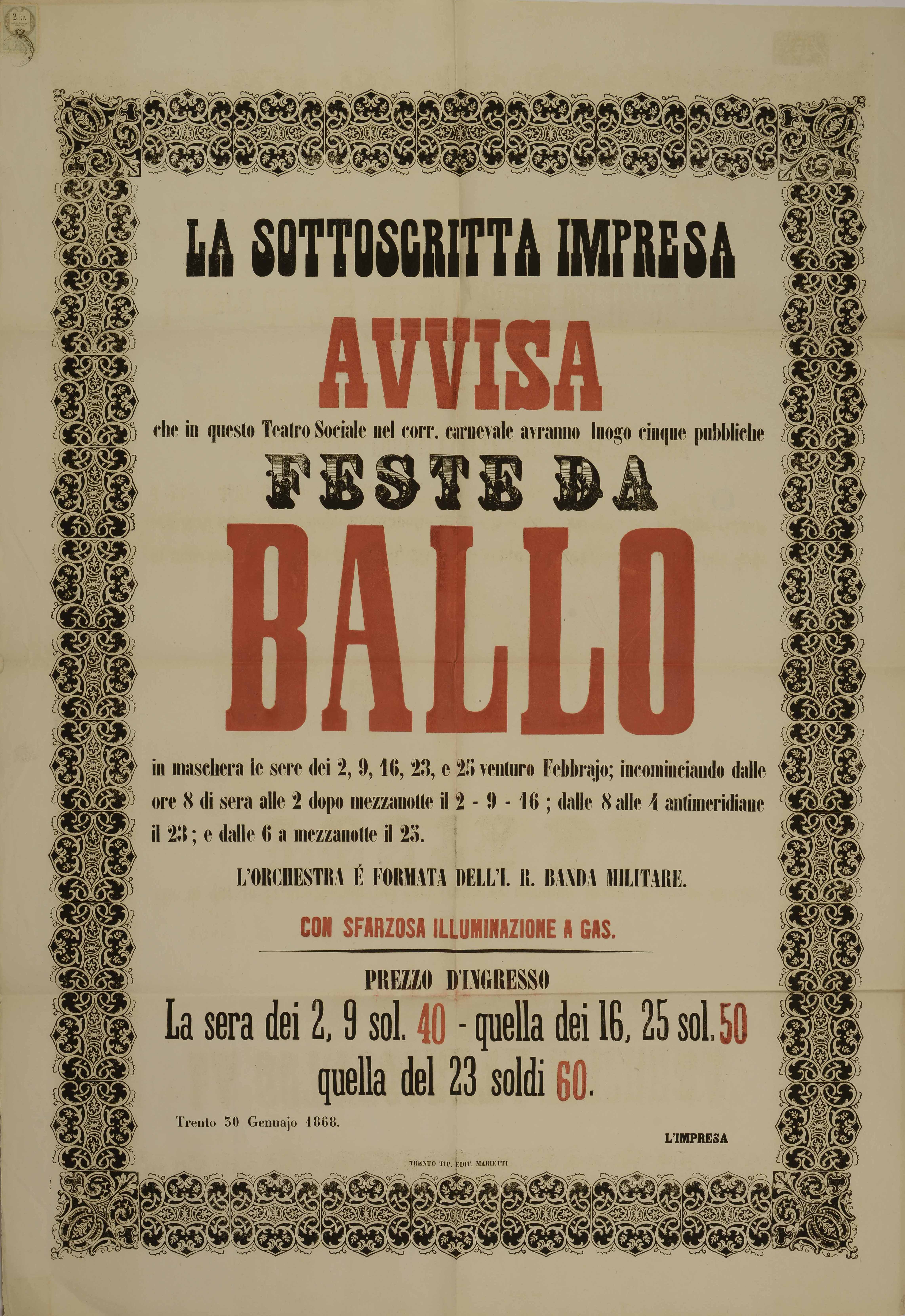 | La sottoscritta impresa avvisa che in questo teatro sociale nel corr. carnevale avranno luogo cinque pubbliche feste da ballo |