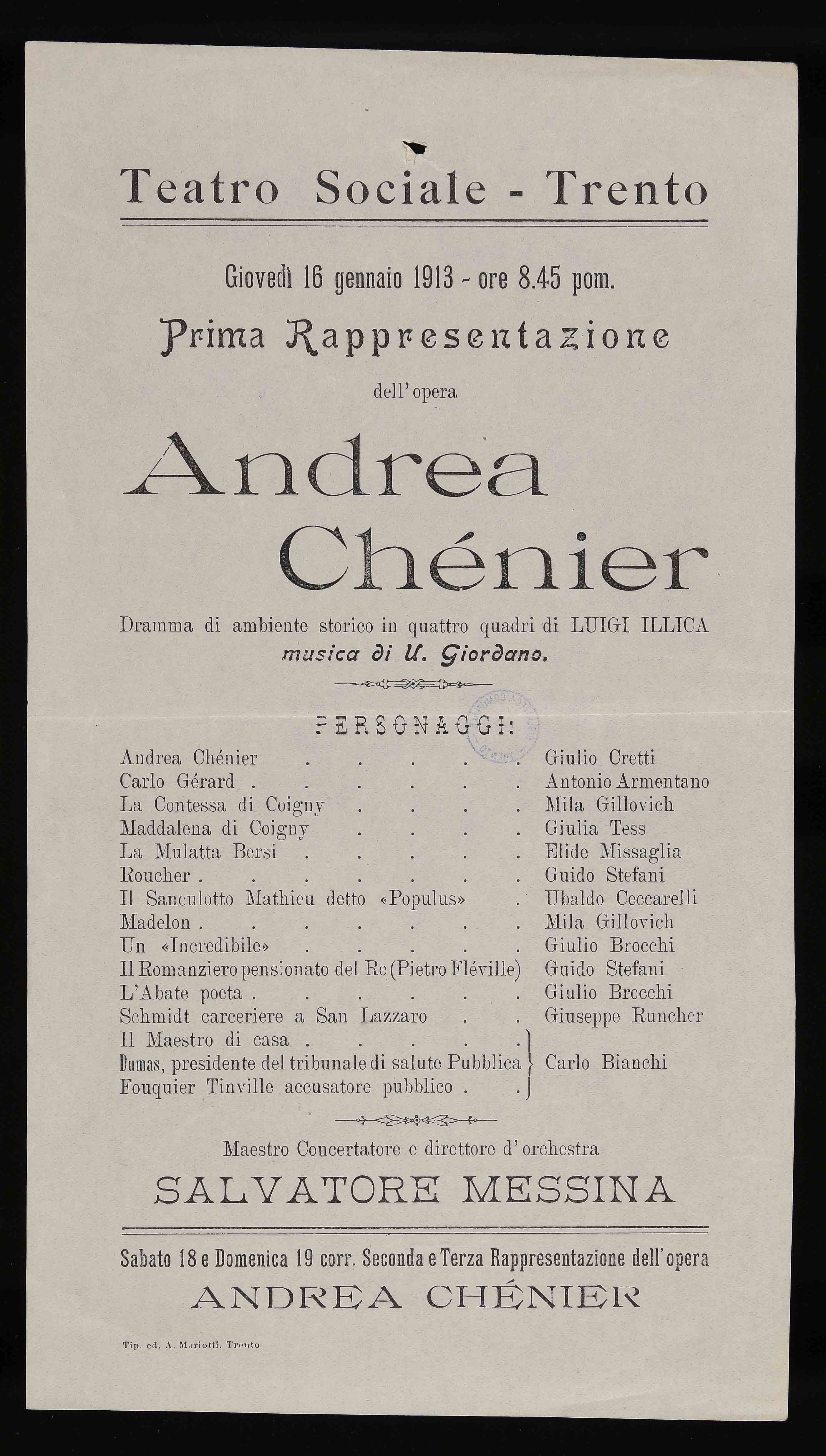 | Teatro Sociale Trento. Giovedì 16 gennaio 1913 ore 8.45 pom. Prima rappresentazione dell'opera Andrea Chénier |