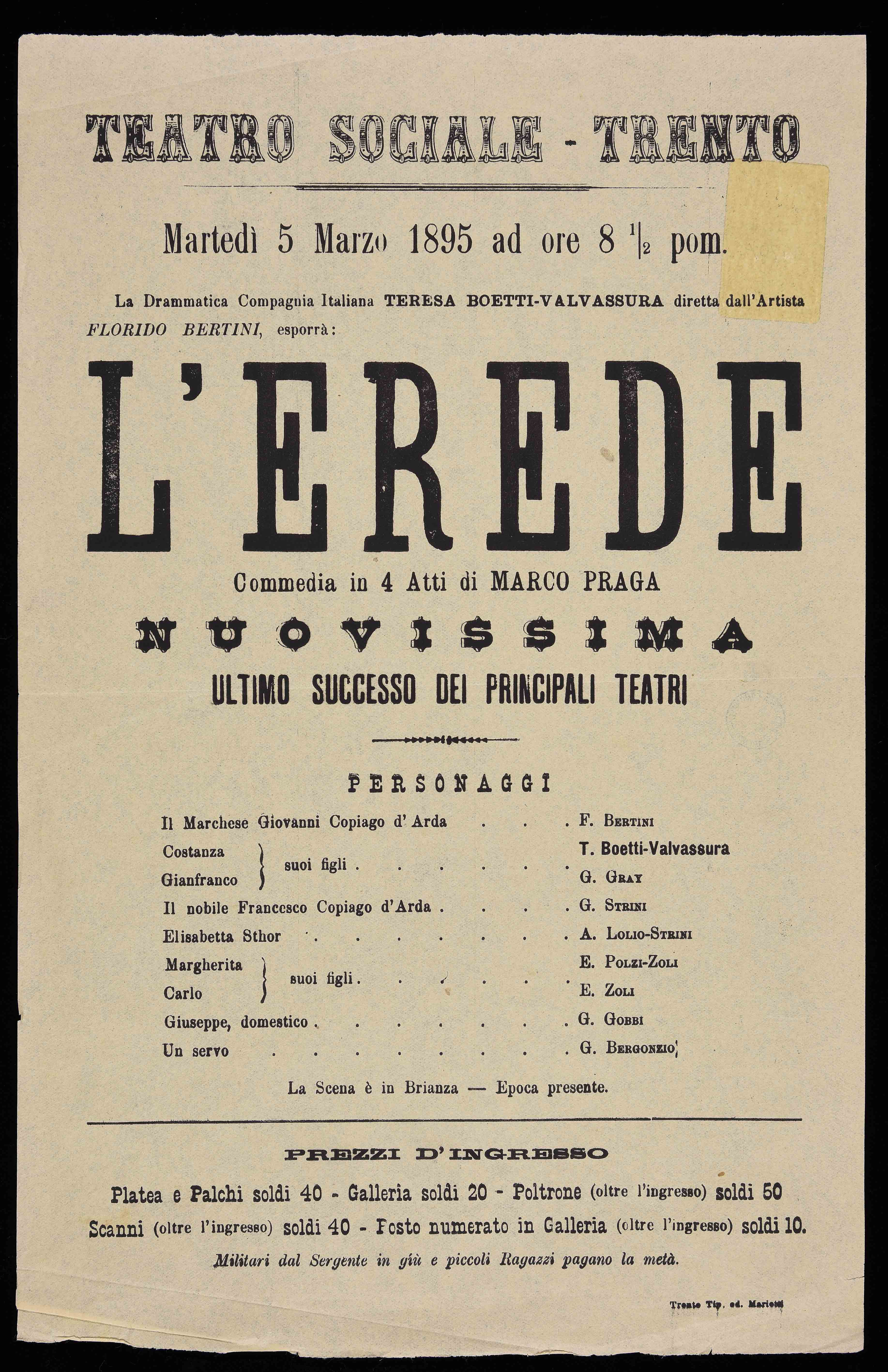 Teatro Sociale – Trento. Martedì 5 marzo 1895 ad ore 8 ½ pom.