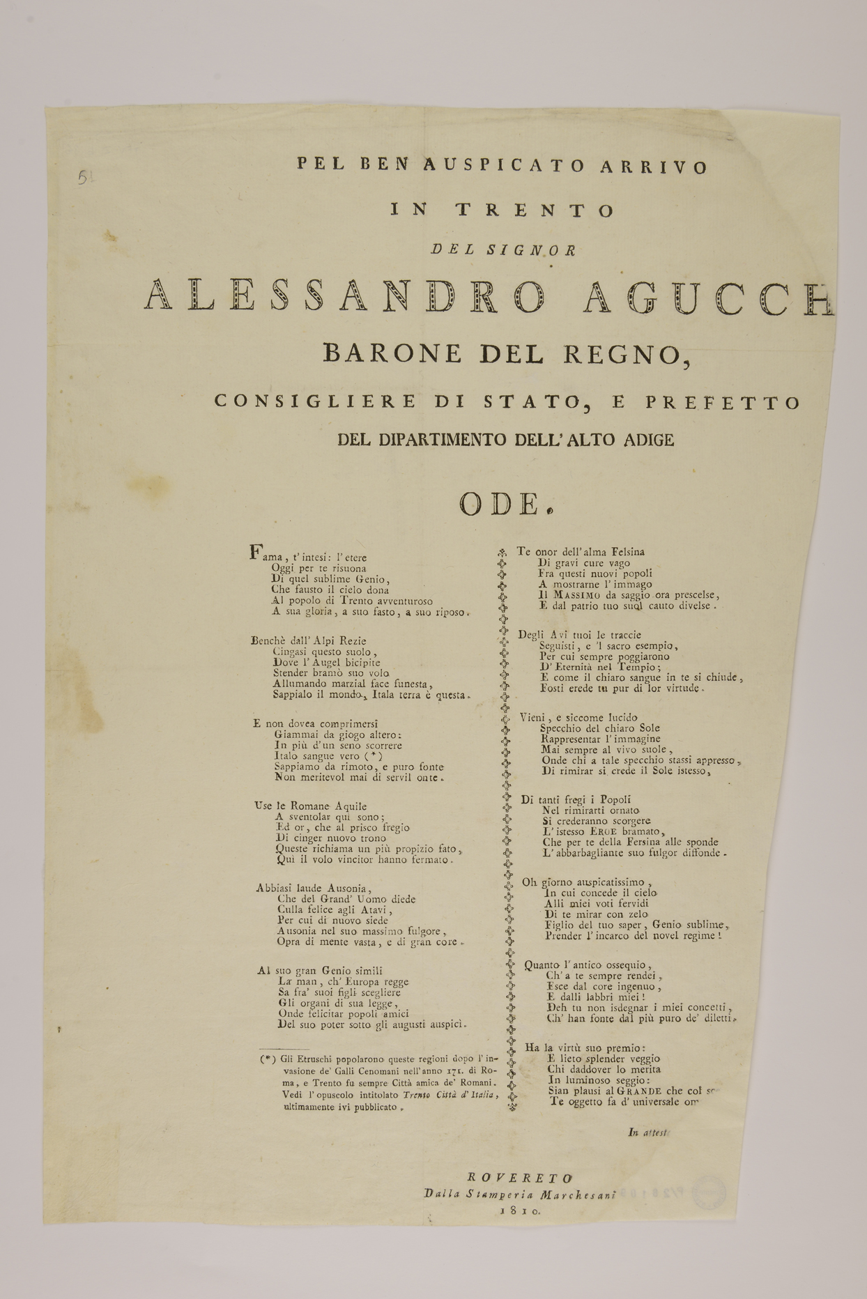 Pel ben auspicato arrivo in Trento del signor Alessandro Agucch[i] barone...