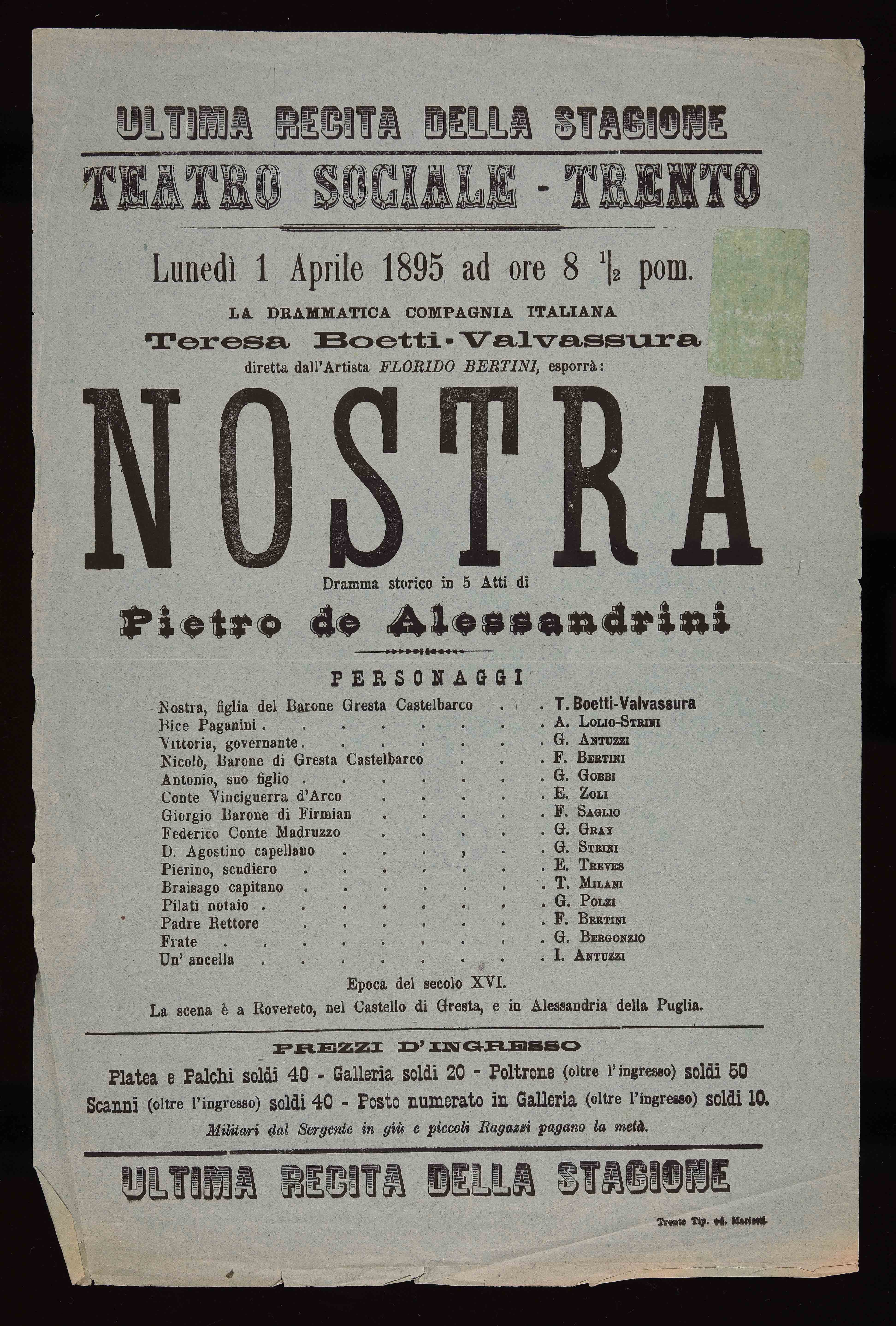 | Teatro Sociale – Trento. Ultima recita della stagione. Lunedì 1 aprile 1895 ad ore 8 ½ pom. |