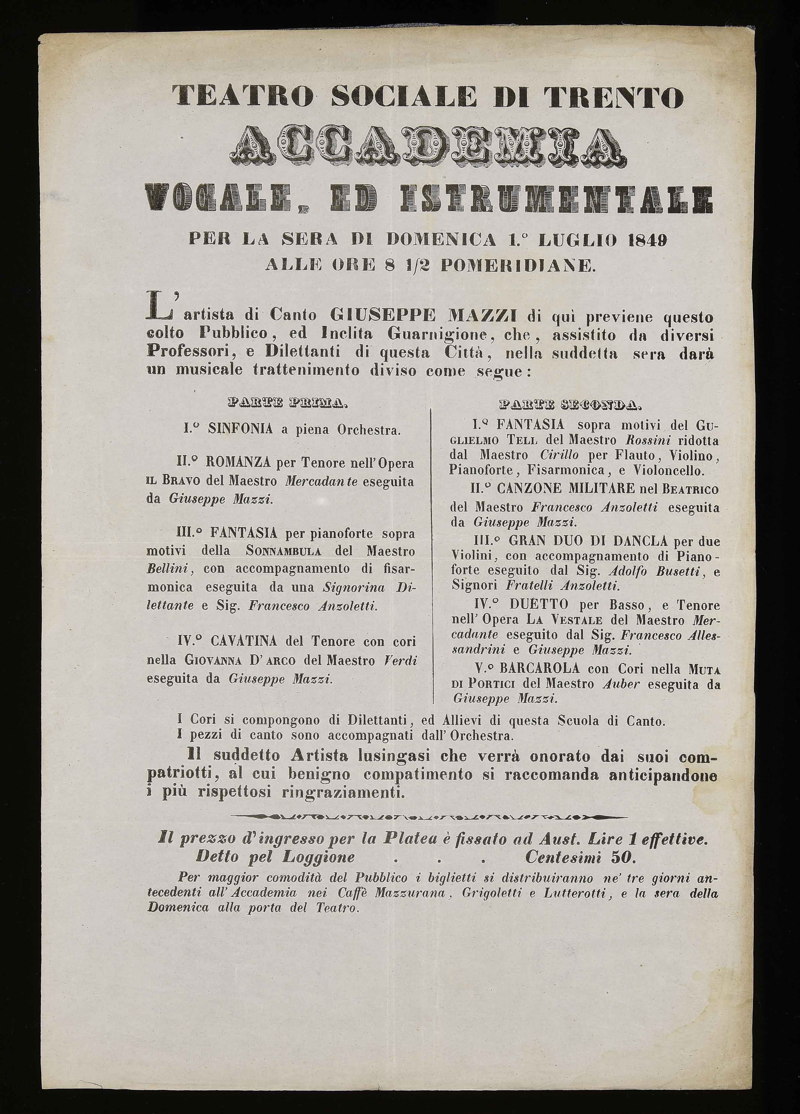 | Teatro sociale di Trento. Accademia vocale, ed istrumentale per la sera di domenica 1 luglio 1849 alle ore 8 ½ |