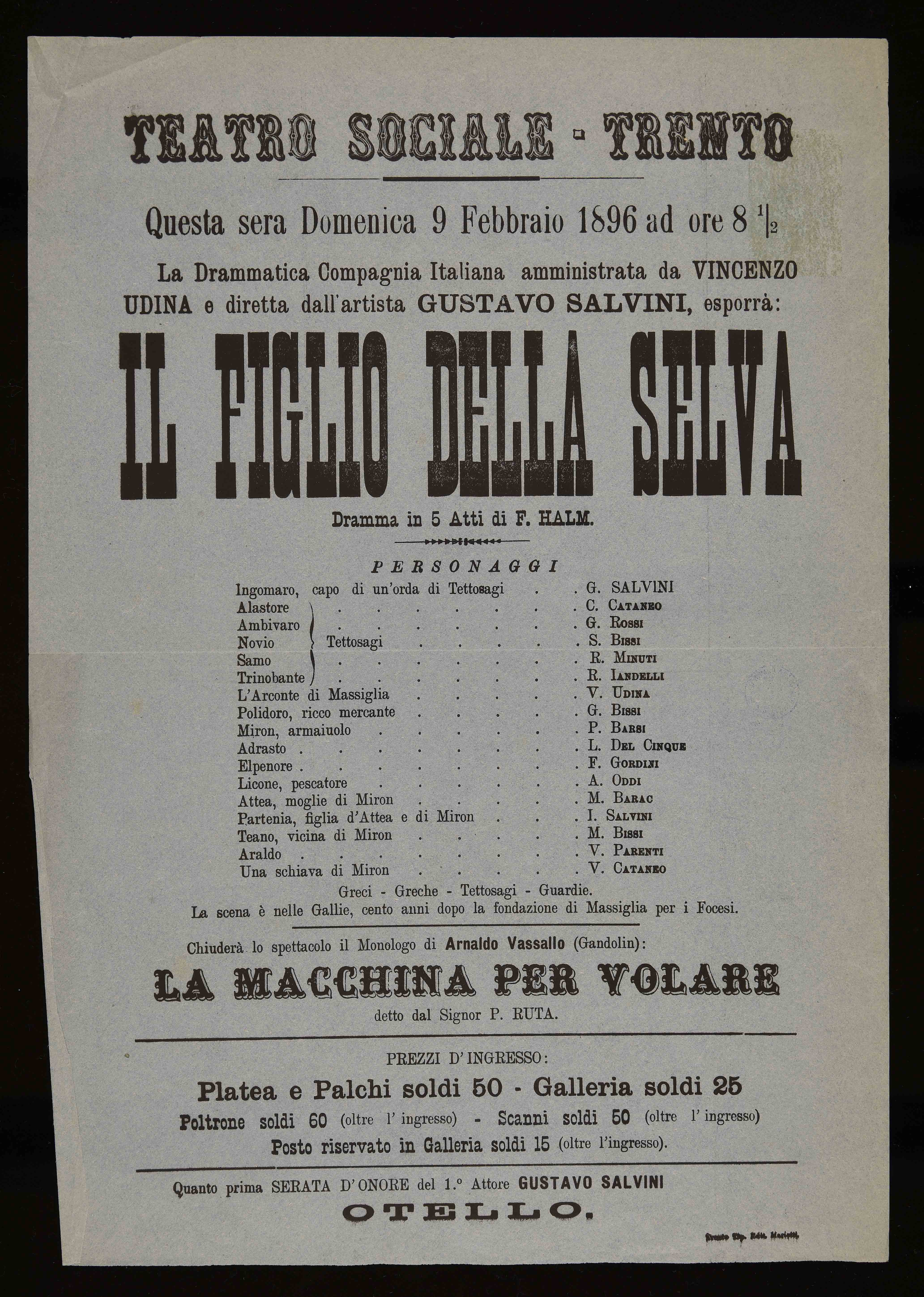 | Teatro Sociale – Trento. Questa sera domenica 9 febbraio 1896 ad ore 8 ½ |