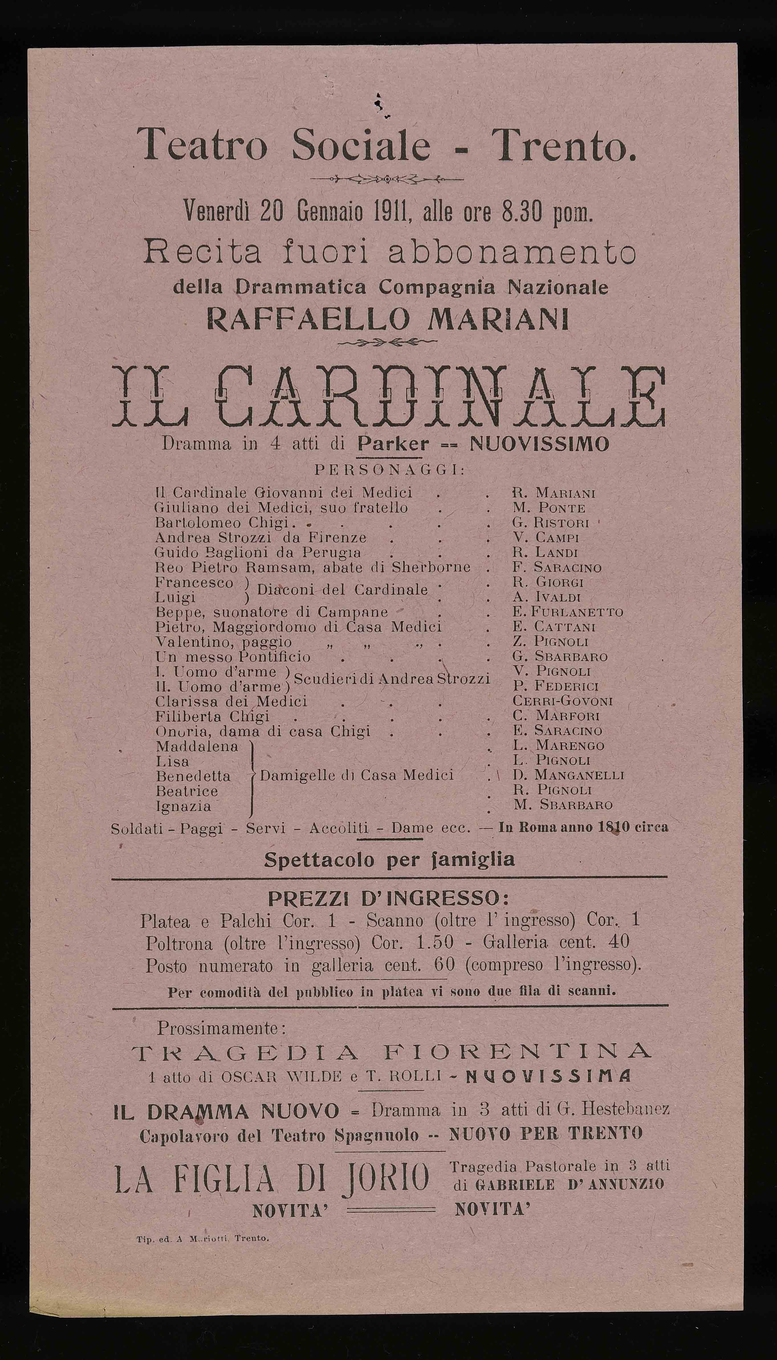 Teatro Sociale – Trento. Venerdì 20 gennaio 1911, alle ore 8.30 pom.