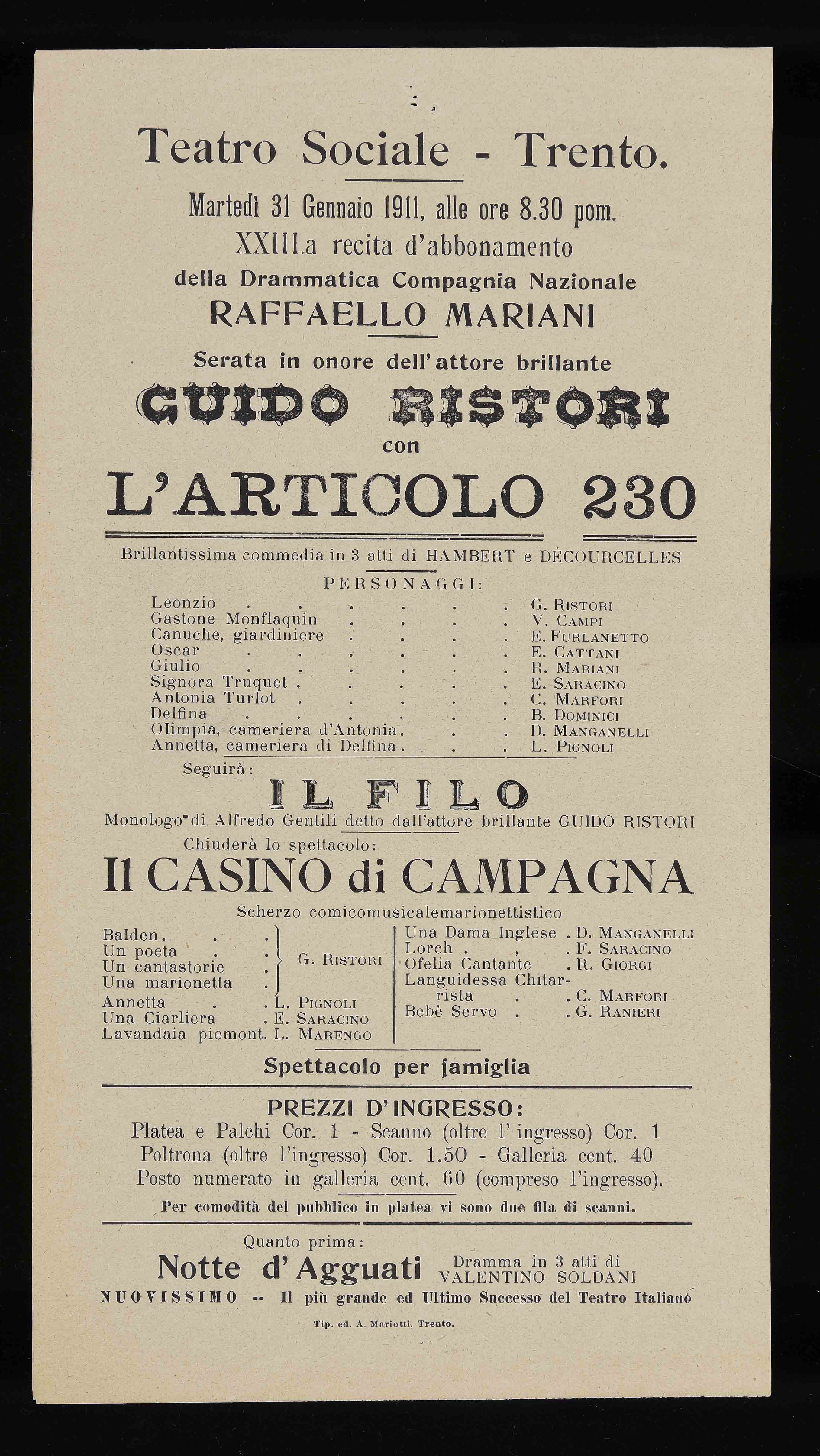 Teatro Sociale – Trento. Martedì 31 gennaio 1911, alle ore 8.30 pom.