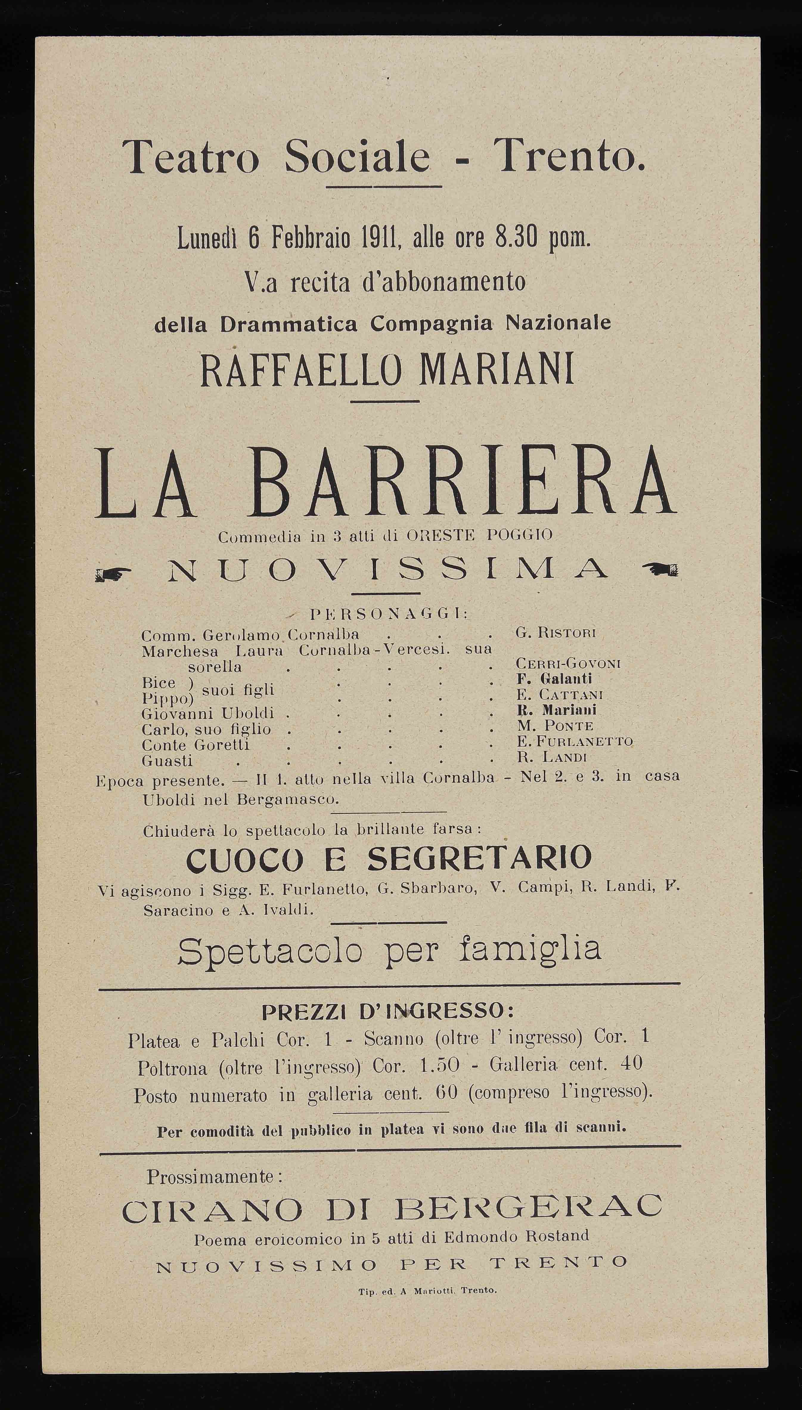 Teatro Sociale – Trento. Lunedì 6 febbraio 1911, alle ore 8.30 pom.