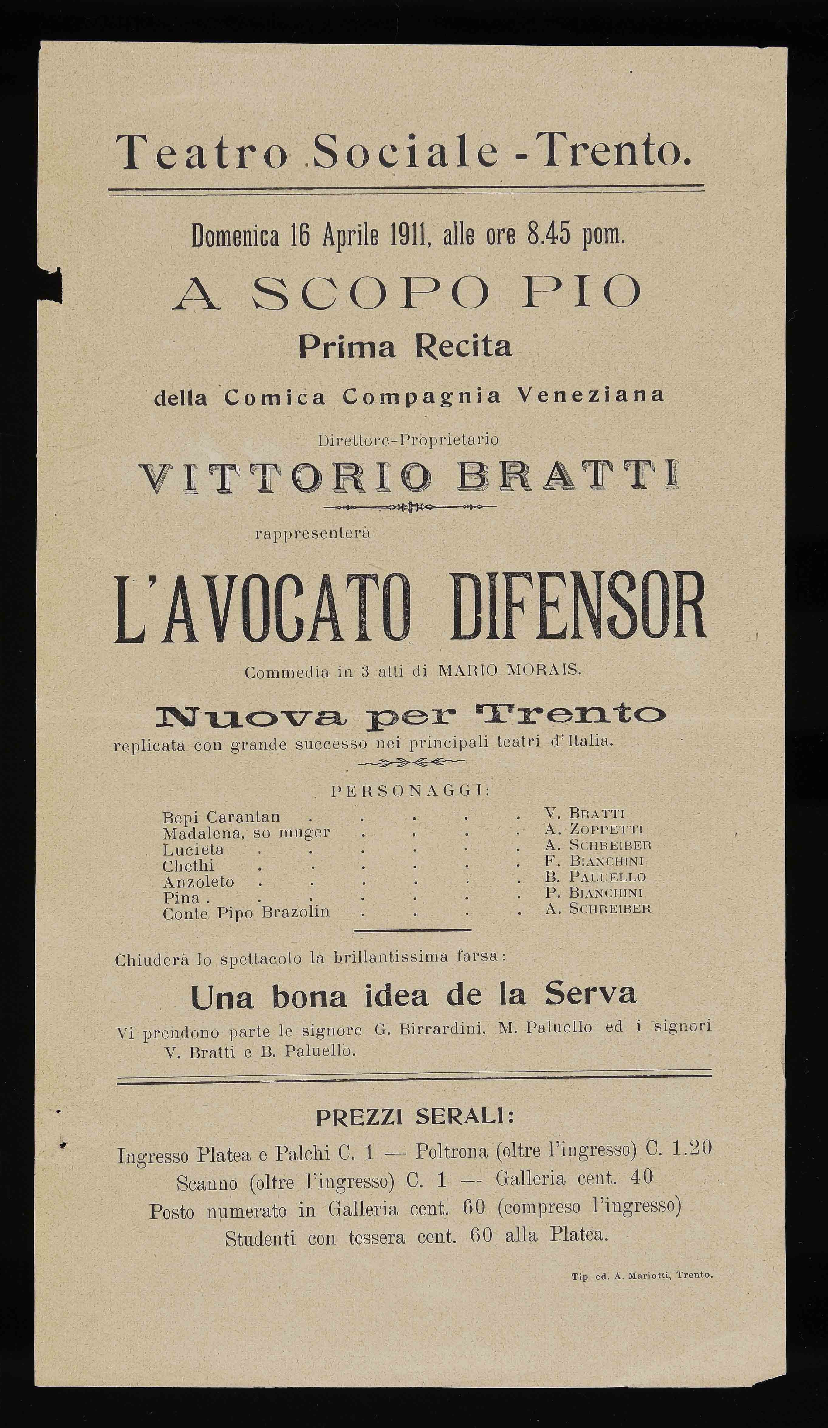 Teatro Sociale – Trento. Domenica 16 aprile 1911, alle ore 8.45 pom.