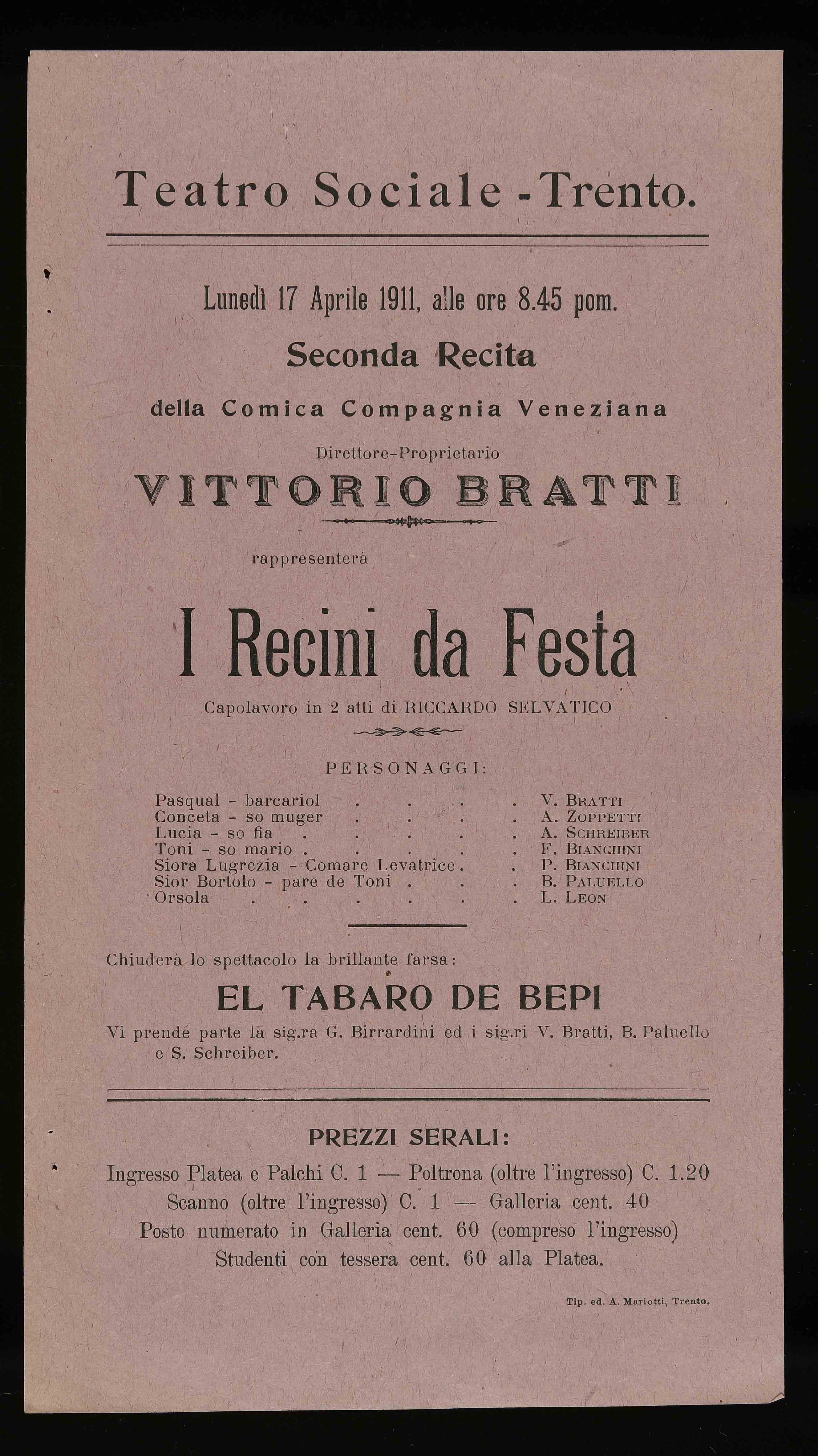 Teatro Sociale – Trento. Lunedì 17 aprile 1911, alle ore 8.45 pom.