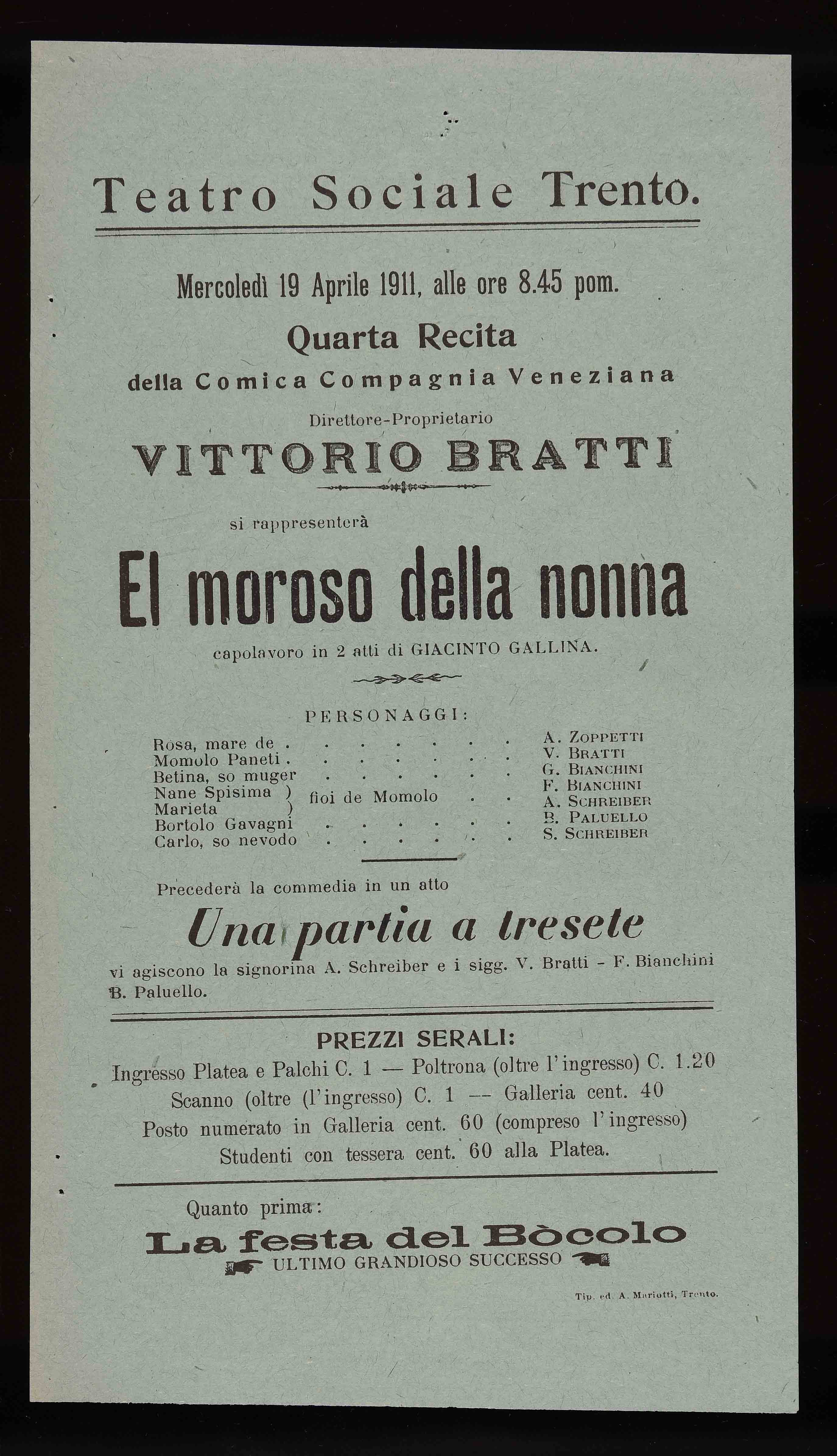 Teatro Sociale Trento. Mercoledì 19 aprile 1911, alle ore 8.45 pom.