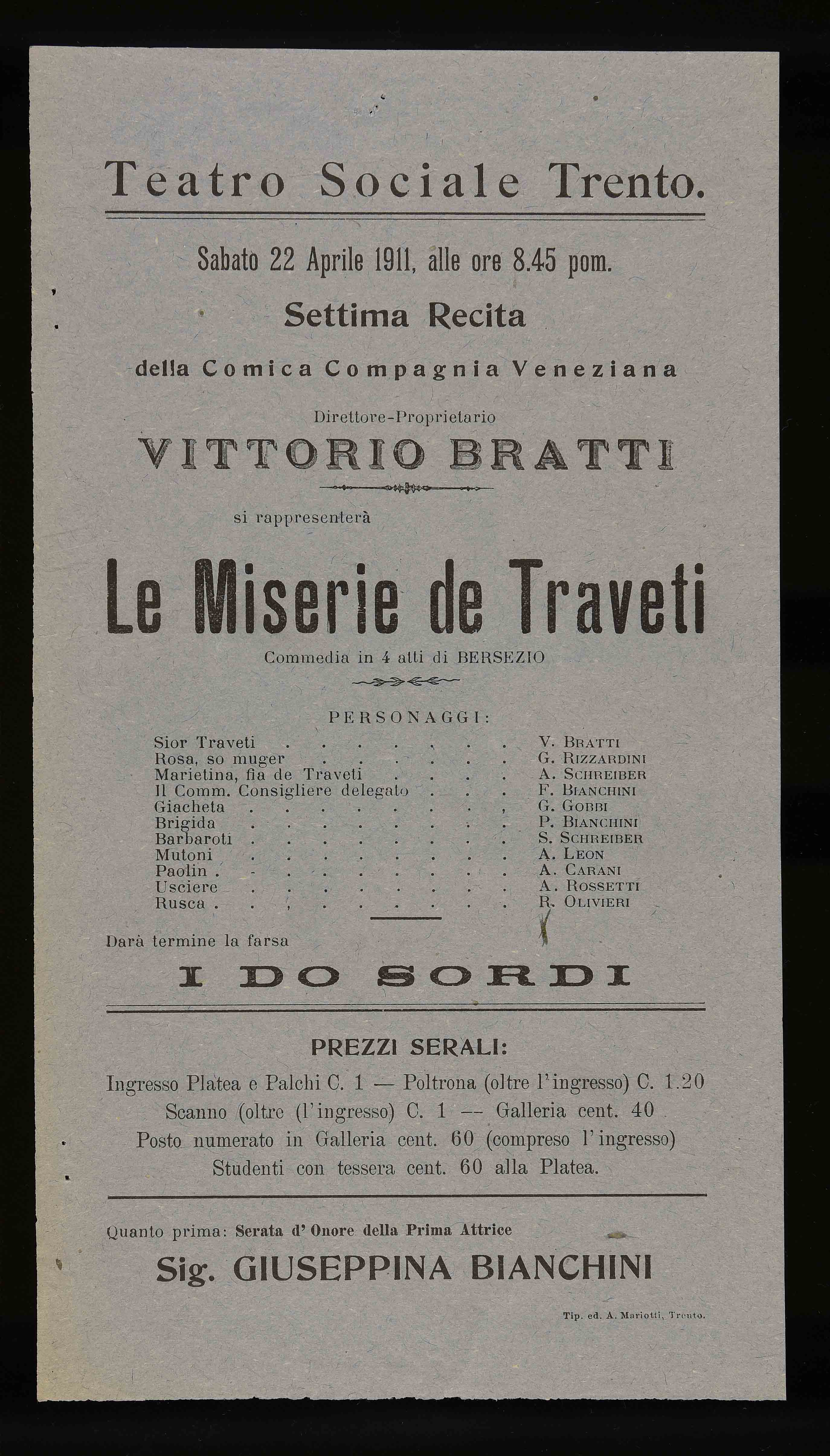 | Teatro Sociale Trento. Sabato 22 aprile 1911, alle ore 8.45 pom. |